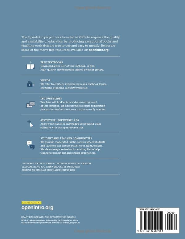 Black and white paperback. Books are printed on demand, so Amazon can satisfy any order size. The OpenIntro project was founded in 2009 to improve the quality and availability of education by producing exceptional books and teaching tools that are free to use and easy to modify. We feature real data whenever possible, and files for the entire textbook are freely available at openintro.org. The future for OpenIntro depends on the involvement and enthusiasm of our community. Visit our website, openintro.org. We provide free videos, statistical software labs, lecture slides, course management tools, and many other helpful resources.