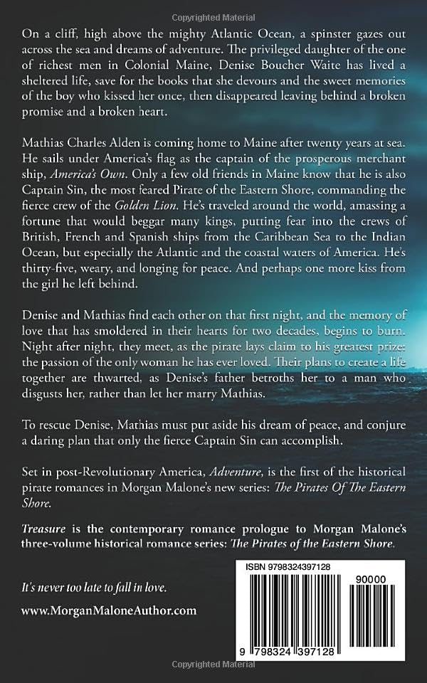 On a cliff, high above the mighty Atlantic Ocean, a spinster gazes out across the sea and dreams of adventure. The privileged daughter of the one of richest men in Colonial Maine, Denise Boucher Waite has lived a sheltered life, save for the books that she devours and the sweet memories of the boy who kissed her once, then disappeared leaving behind a broken promise and a broken heart. Mathias Charles Alden is coming home to Maine after twenty years at sea. He sails under America’s flag as the captain of the prosperous merchant ship, America’s Own. Only a few old friends in Maine know that he is also Captain Sin, the most feared Pirate of the Eastern Shore, commanding the fierce crew of the Golden Lion. He’s traveled around the world, amassing a fortune that would beggar many kings, putting fear into the crews of British, French and Spanish ships from the Caribbean Sea to the Indian Ocean, but especially the Atlantic and the coastal waters of America. He’s thirty-five, weary, and longing for peace. And perhaps one more kiss from the girl he left behind. Denise and Mathias find each other on that first night, and the memory of love that has smoldered in their hearts for two decades, begins to burn. Night after night, they meet, as the pirate lays claim to his greatest prize: the passion of the only woman he has ever loved. Their plans to create a life together are thwarted, as Denise’s father betroths her to a man who disgusts her, rather than let her marry Mathias. To rescue Denise, Mathias must put aside his dream of peace, and conjure a daring plan that only the fierce Captain Sin can accomplish. Set in post-Revolutionary America, Adventure, is the first of the historical pirate romances in Morgan Malone’s new series: The Pirates Of The Eastern Shore.