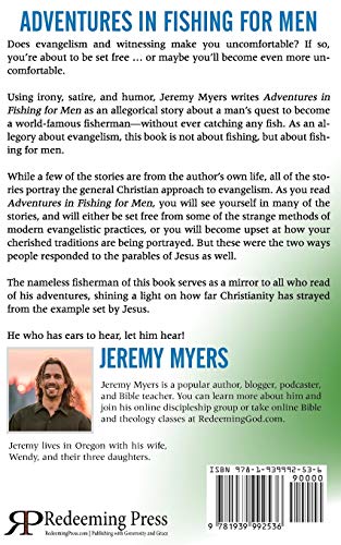 Does evangelism and witnessing make you uncomfortable? If so, you’re about to be set free … or maybe you’ll become even more uncomfortable. Using irony, satire, and humor, Jeremy Myers writes Adventures in Fishing for Men as an allegorical story about a man’s quest to become a world-famous fisherman–without ever catching any fish. As an allegory about evangelism, this book is not about fishing, but about fishing for men. While a few of the stories are from the author’s own life, all of the stories portray the general Christian approach to evangelism. As you read Adventures in Fishing for Men, you will see yourself in many of the stories, and will either be set free from some of the strange methods of modern evangelistic practices, or you will become upset at how your cherished traditions are being portrayed. But these were the two ways people responded to the parables of Jesus as well. The nameless fisherman of this book serves as a mirror to all who read of his adventures, shining a light on how far Christianity has strayed from the example set by Jesus. He who has ears to hear, let him hear!