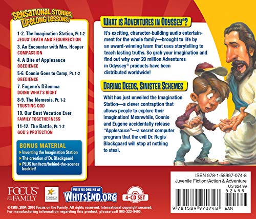 Evil has a name. And it goes by Dr. Regis Blackgaard. He and Philip Glossman have big plans that could put Whit’s End out of business. And it looks like the bad guys are winning! Eventually, right overcomes might while kids ages 8 and up learn about making smart choices and having integrity. Adventures in Odyssey is exciting, values-based audio entertainment for the whole family–brought to life by actors who make you feel like part of the experience. Volume 5 contains the following stories (and themes): The Imagination Station, 1 & 2 (Jesus’ crucifixion and resurrection) An Encounter with Mrs. Hooper (Compassion for the elderly) A Bite of Applesauce (Disobedience) Connie Goes to Camp, 1 & 2 (Disobedience) Eugene’s Dilemma (Doing what’s right; responsibility) The Nemesis,1 & 2 (Trusting God in times of trouble) Our Best Vacation Ever (Family togetherness) The Battle, 1 & 2 (God’s protection)