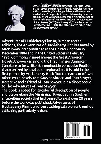 Adventures of Huckleberry Finn or, in more recent editions, The Adventures of Huckleberry Finn is a novel by Mark Twain, first published in the United Kingdom in December 1884 and in the United States in February 1885. Commonly named among the Great American Novels, the work is among the first in major American literature to be written throughout in vernacular English, characterized by local color regionalism. It is told in the first person by Huckleberry Huck finn, the narrator of two other Twain novels Tom Sawyer Abroad and Tom Sawyer, Detective and a friend of Tom Sawyer. It is a direct sequel to The Adventures of Tom Sawyer. The book is noted for its colorful description of people and places along the Mississippi River. Set in a Southern antebellum society that had ceased to exist over 20 years before the work was published, Adventures of Huckleberry Finn is an often scathing satire on entrenched attitudes, particularly racism.
