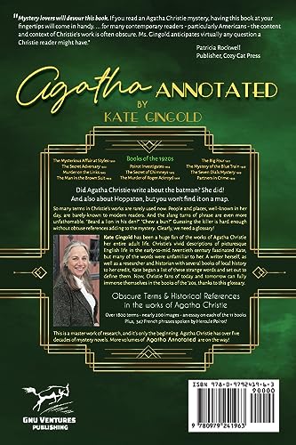 Do you love Agatha Christie mystery novels, but skip over any unfamiliar references? Then you’re missing out! Read Christie’s books as if you were her 1920s contemporary by exploring the background of: Quaint English customs Poirot’s French expressions Quirky British slang Post-World War I lifestyles And much more Years of research by history buff and Christie fan Kate Gingold has been collected in this glossary covering the first decade of Agatha Christie’s mysteries. Inside you will find over 1800 terms, including 347 French phrases from Hercule Poirot, each with a definition and its location within the stories. Nearly 200 are accompanied by an illustration. As a bonus, the author takes a “Closer Look” at a topic from each of Christie’s first eleven books. Enjoy your favorite Christie novel even more with this guide to deciphering the definition and context of these hundred-year-old words and phrases. It’s the perfect Agatha Christie gift for every fan. “Ms. Gingold anticipates virtually any question a Christie reader might have.” – Patricia Rockwell, Cozy Cat Press