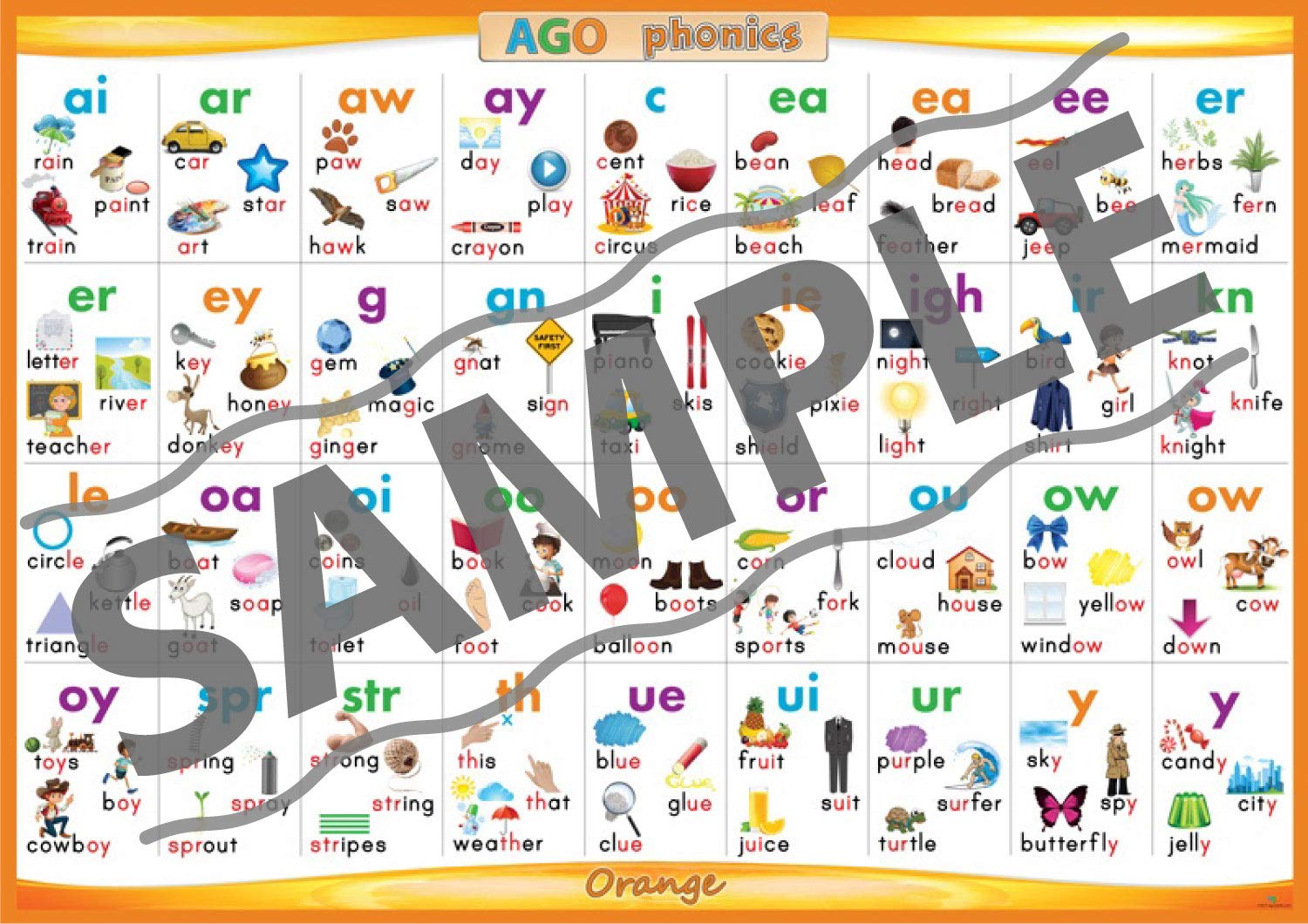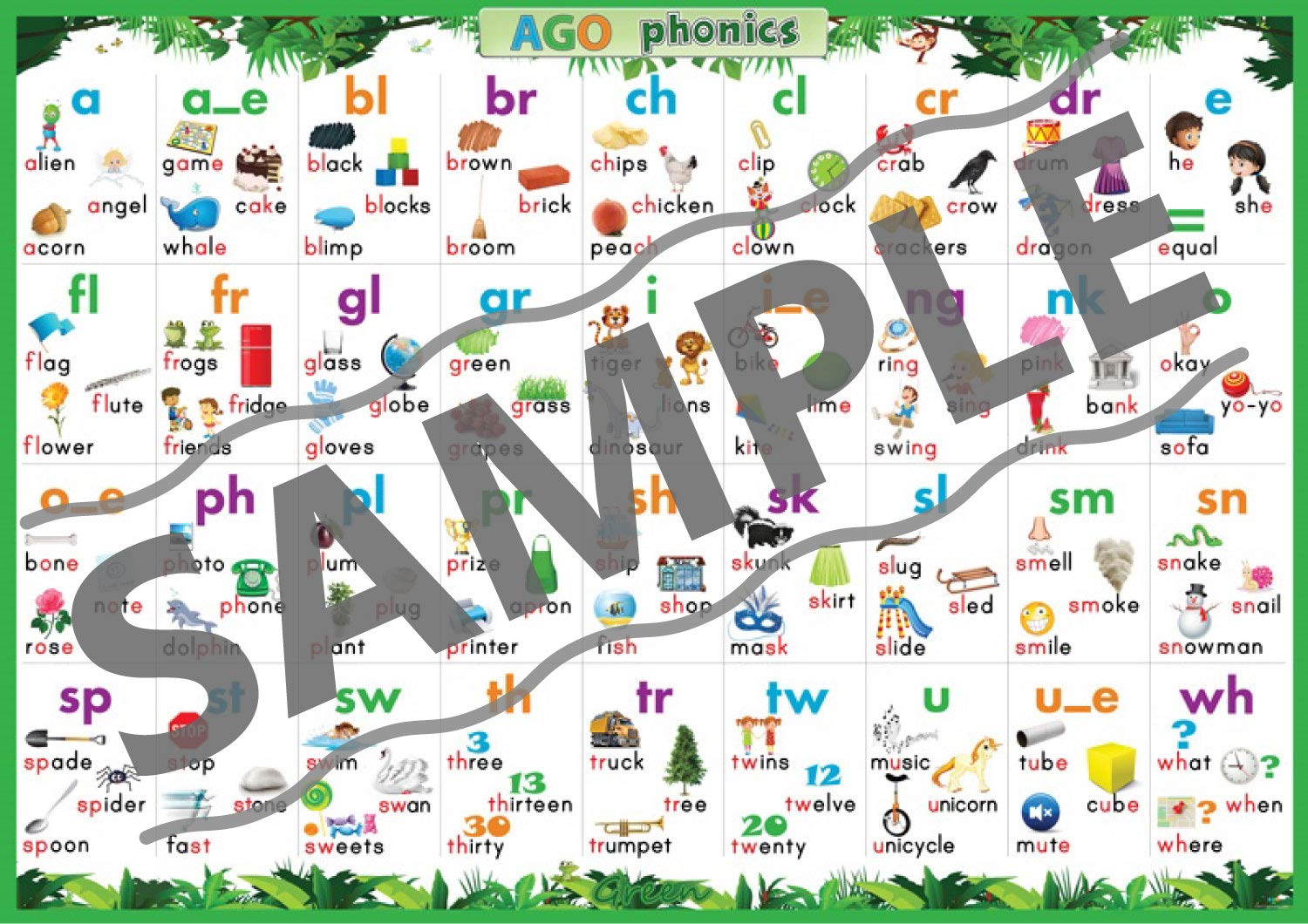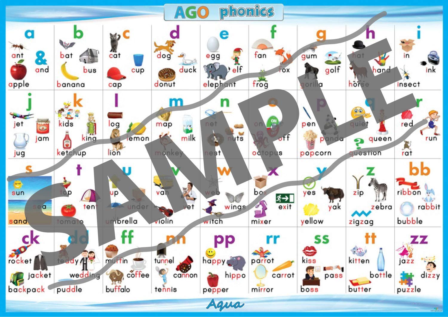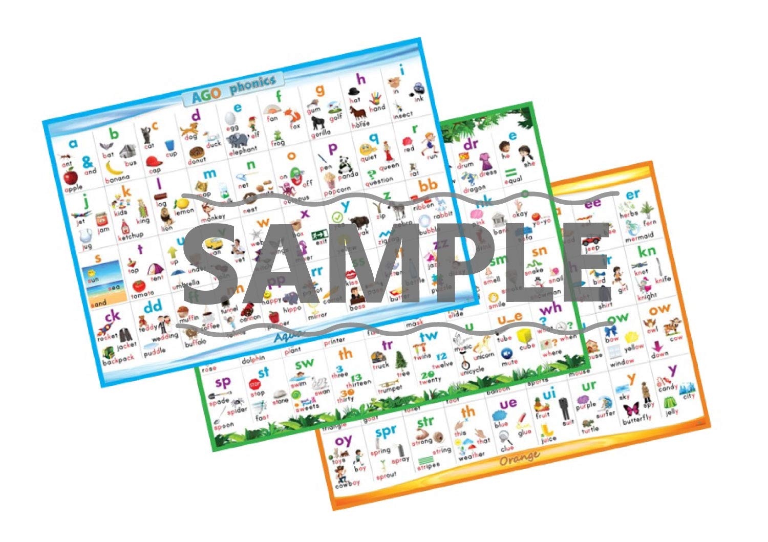 • Three large folded posters (A1 size – / 2.75 / 2 feet). Content matches the three AGO Phonics box set card game levels.