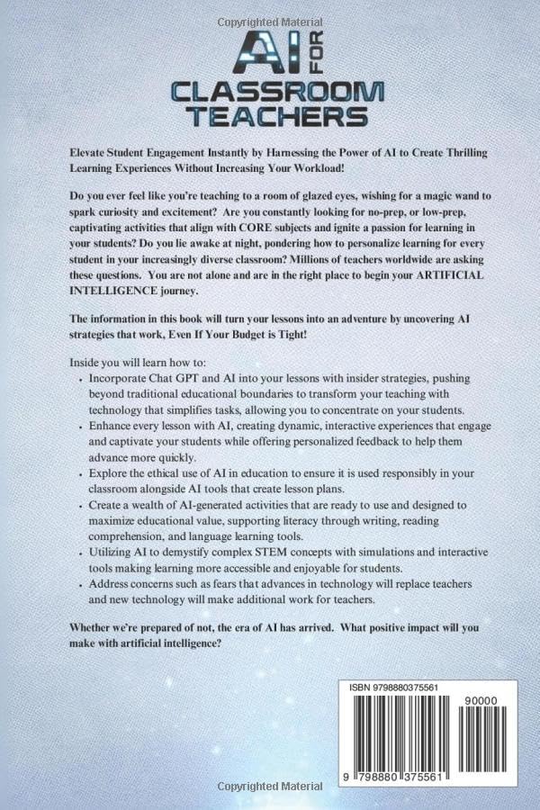 Elevate Student Engagement Instantly by Harnessing the Power of AI to Create Thrilling Learning Experiences Without Increasing Your Workload! The information in this book will turn your lessons into an adventure by uncovering AI strategies that work, Even If Your Budget Is Tight! Bonus Chapter with 200+ CHATGPT Prompts Do you ever feel like you’re teaching to a room of glazed eyes, wishing for a magic wand to spark curiosity and excitement? Are you constantly looking for no-prep, captivating activities that align with CORE subjects and ignite a passion for learning in your students? Do you lie awake at night, pondering how to personalize learning for every student in your increasingly diverse classroom? Millions of teachers worldwide are asking these questions. You are not alone and are in the right place to begin your ARTIFICIAL INTELLIGENCE journey. Here’s what’s inside! Learn the insider strategies for seamlessly incorporating Chat GPT and AI into your lessons. Venture beyond the horizon of current educational practices and explore the exciting future that Chat-GPT and AI promise Transform your teaching experience with technology that handles the heavy lifting, so you can focus on what really matters–your students. Elevate your educational impact with AI, turning every lesson into a dynamic, interactive experience that captivates students. Instantly provide personalized, constructive feedback with AI-powered tools, helping students improve faster than ever before. Delve into the ethical considerations of using AI in education, ensuring responsible and beneficial use of technology in your classroom. Discover AI tools that generate lesson plans, activities, and assessments, freeing up your time to focus on what you do best–teaching. Access a treasure trove of AI-generated activities that require zero preparation but deliver maximum educational value. Use AI to enhance literacy, providing students with tools for writing assistance, reading comprehension, and language learning. Break down complex STEM concepts with AI-powered simulations and interactive tools that make learning accessible and fun. Concerns among teachers that introducing AI into classrooms might lead to job losses are understandable. The fear is that technology could replace rather than assist them. However, it’s crucial to recognize that education transcends mere academic achievement. It’s about equipping young people with the life skills–critical thinking, empathy, resilience, and responsibility–that only human interactions and real-life examples can impart. In this light, artificial intelligence isn’t a replacement for teachers; instead, it’s a tool that can liberate time for these vital human-centric teachings. The apprehension about the extra time required to learn and integrate new AI tools into the educational process is also a common concern. Yet, this is where modern AI solutions shine. With their plug-and-play nature, setting up AI in your classroom becomes as effortless as making your morning coffee. These tools boast user-friendly interfaces designed to be accessible, even for those less confident with technology. The promise of AI in education is not about complicating teachers’ lives with technology but simplifying and enhancing the teaching and learning experience. Say farewell to the days of cumbersome setups and embrace the age of instant, magical educational enhancements. If you want to unleash the transformative power of AI in your classroom and ignite your students’ passion for learning, then scroll up and click the “Add to Cart” button now!