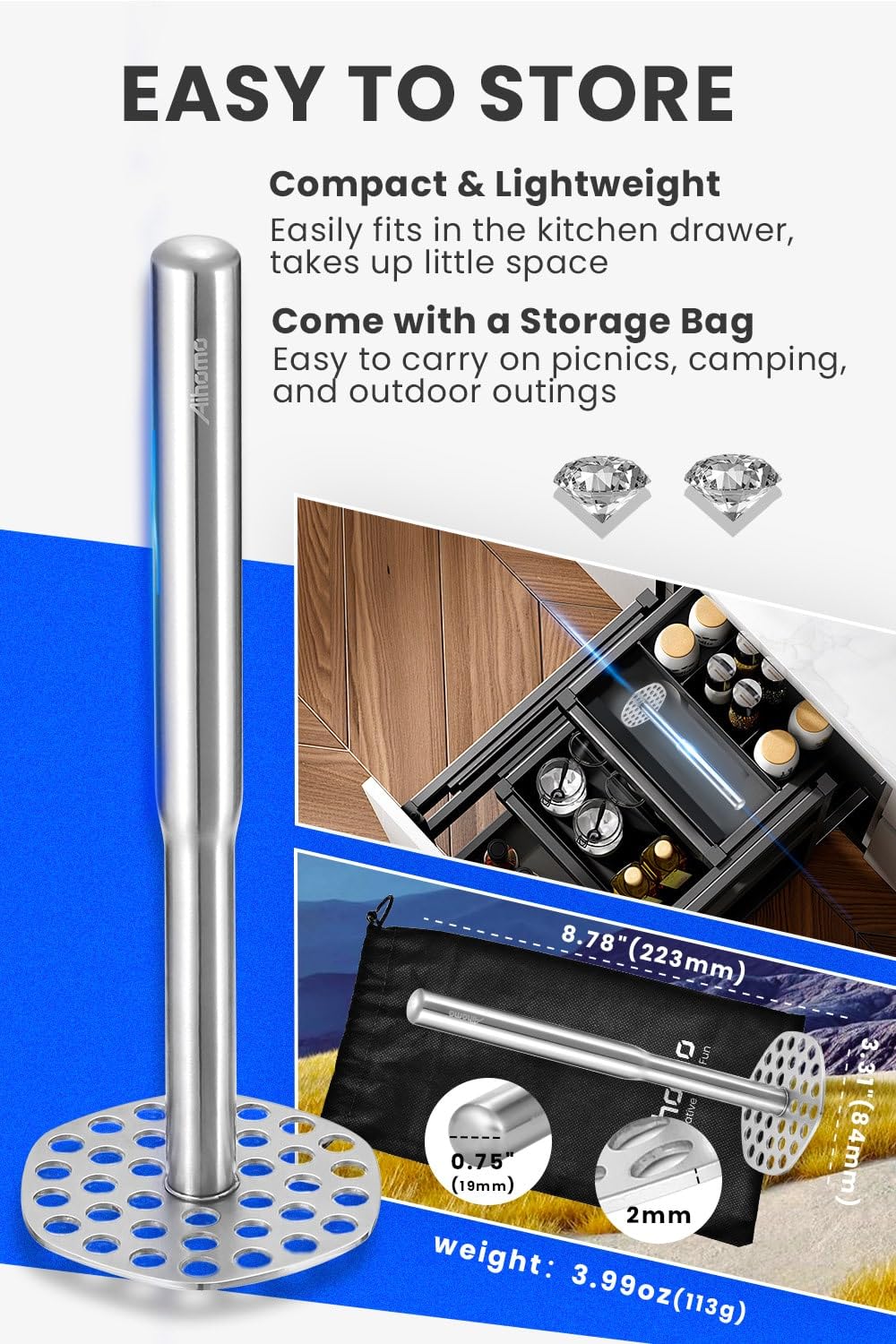 - WONDERFUL GIFT – Aihomo potato mashers are packaged in boxes and come with a long-lasting storage bag, which makes it a wonderful gift for occasions like birthdays, housewarmings, etc., and is meaningful for dads, moms, and friends