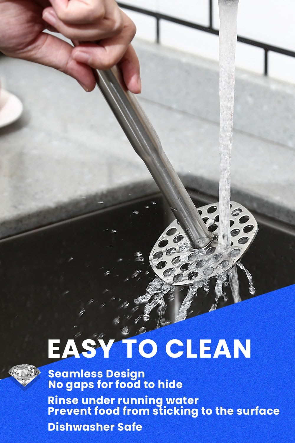 - SEAMLESS ONE-PIECE DESIGN – Engineered with a one-piece construction, potatoes masher has no gaps to trap food. The finely processed head prevents scratches or cuts and ensures easy cleaning by avoiding food buildup