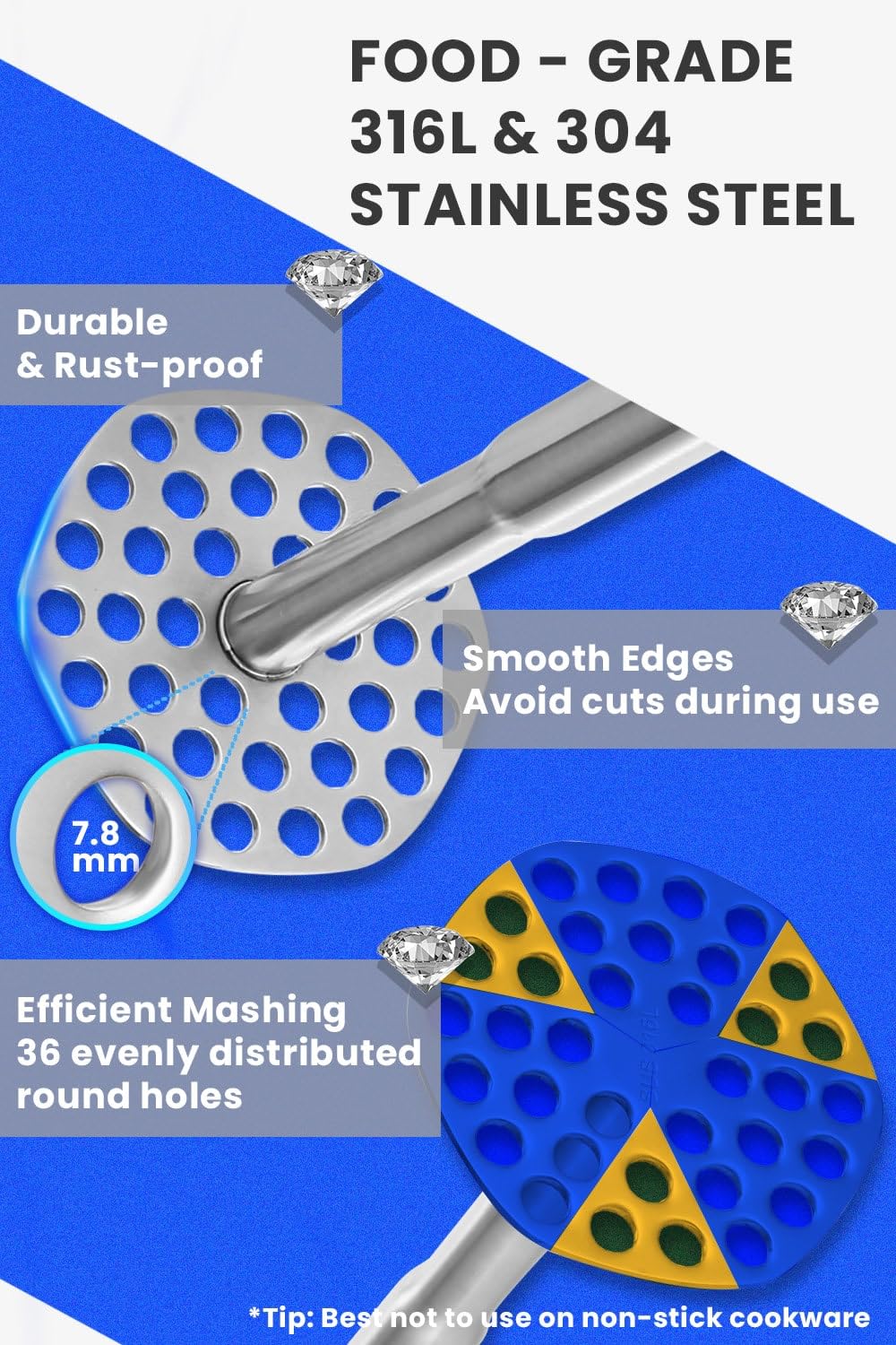 - 316L FOOD-GRADE – The potato masher’s head is crafted from food-grade 316L stainless steel, paired with a food-grade 304 stainless steel handle. Solid and durable, it resists rust and cracking for long-lasting performance