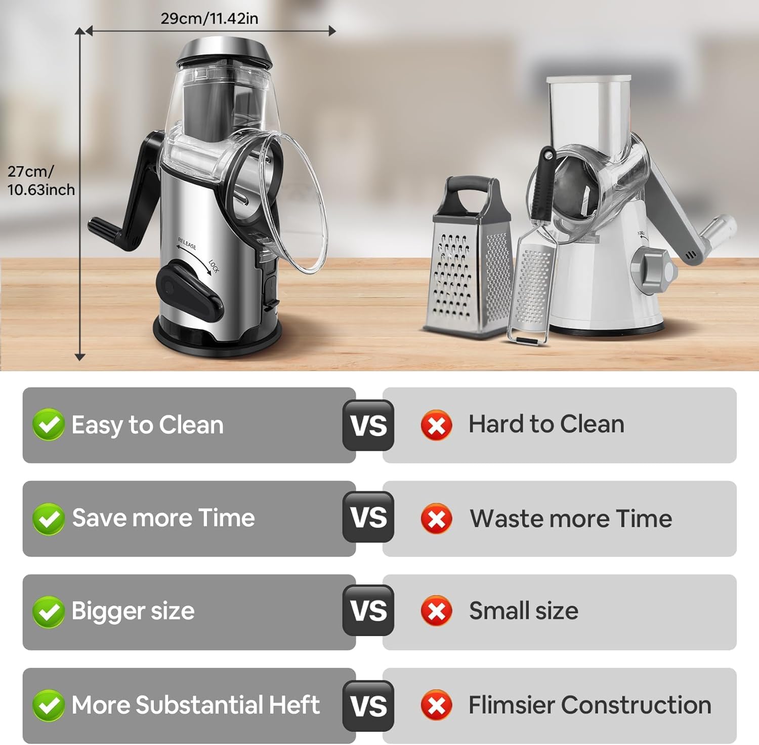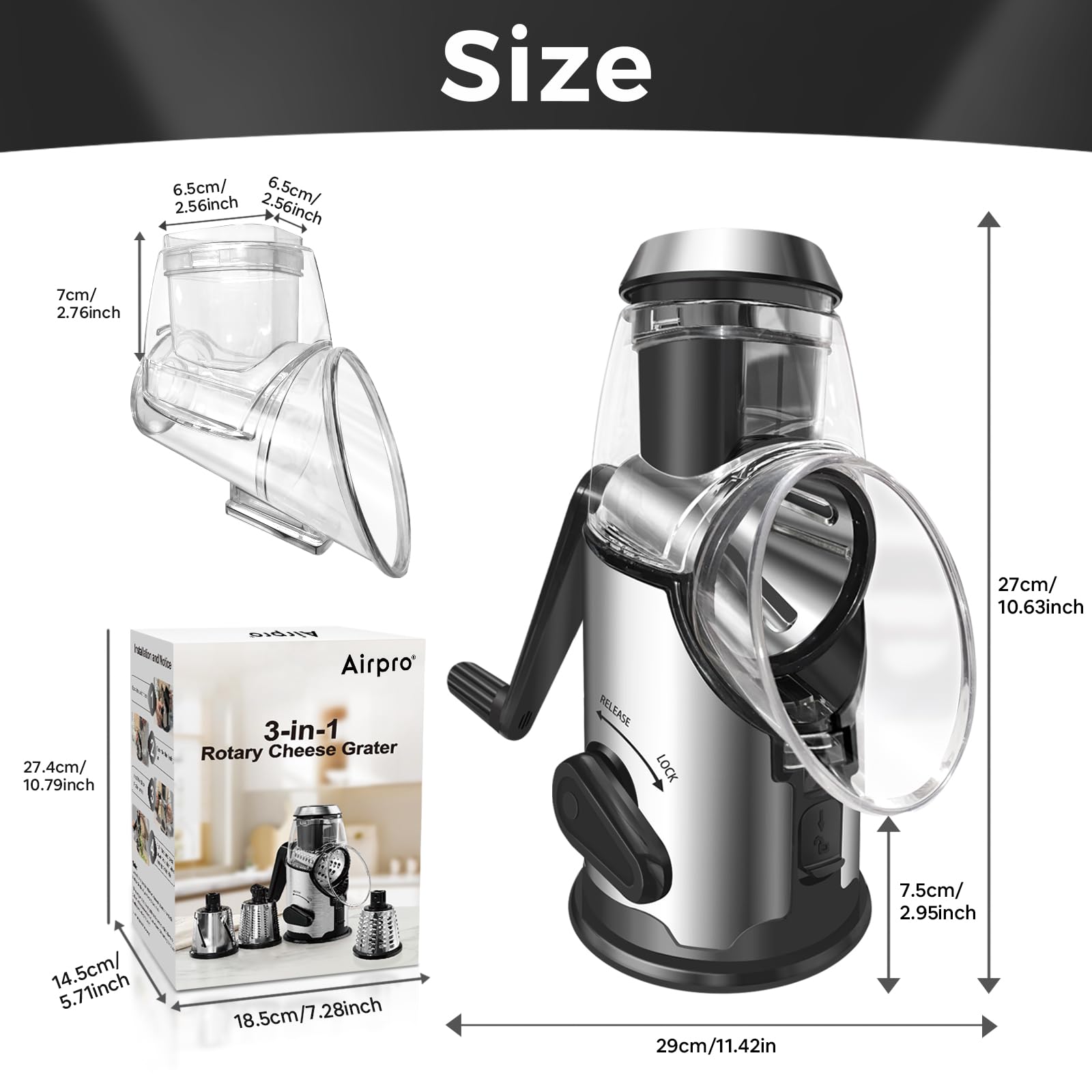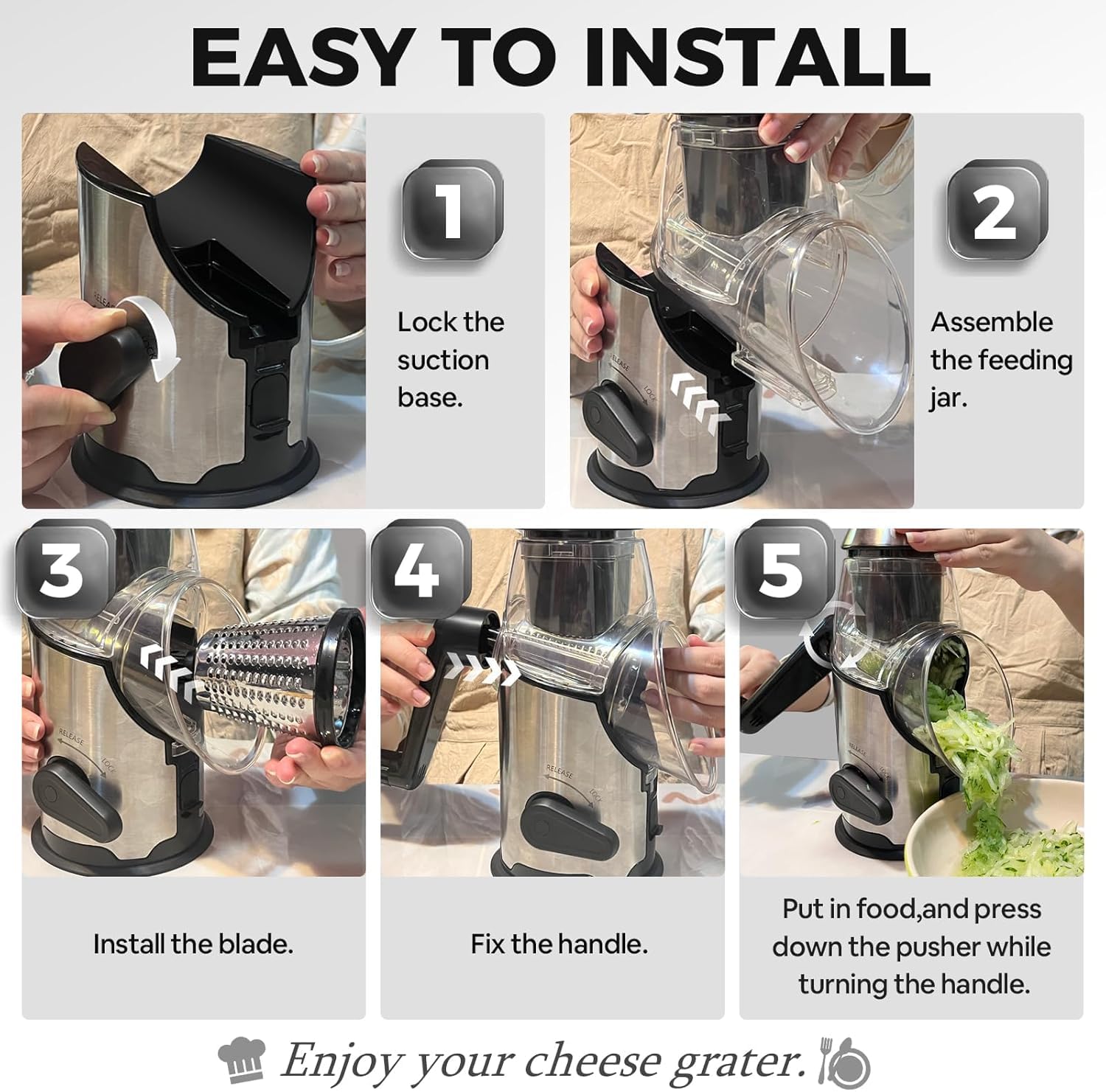 - SERVICE & PROMISE: We will provide a comprehensive user guide to ensure easy operation even for first time users. quality after-sales customer support. You can use it with confidence, please feel free to contact us if you have any questions about our cheese grater. The rotary cheese grater is an ideal gift for cooking enthusiasts, family or friends.