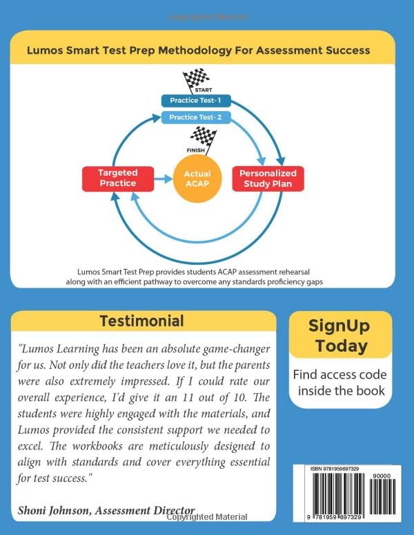 Alabama Comprehensive Assessment Program (ACAP) 3rd Grade Math Workbook for Kids (Ages 8-9) Boost your child’s ACAP test scores using the Lumos Grade 3 Math Test Prep Workbook. Crafted by expert educators, this workbook comprehensively covers over 25 essential math skills tailored for third graders. Featuring a wide variety of standards-aligned practice questions, the Lumos ACAP workbook supports your child to enhance math proficiency through consistent daily and weekly practice, resulting in improved ACAP test scores. Why You’ll Love This 3rd Grade Math Book for 2023-24 ACAP Test Prep Excel in 25 Essential Math Skills: Master key math concepts including Operations & Algebraic Thinking, Number & Operations in Base Ten, Number & Operations – Fractions, Measurement & Data, and Geometry. This comprehensive workbook fosters not just success in the Alabama state assessment, but also cultivates a robust academic groundwork. Boost State Test Success: Lumos ACAP test prep workbooks break free from traditional print workbooks. It features a wide variety of standards-aligned content in both print and online formats. Lumos Smart Test Prep Methodology: Unlock success on the Alabama Comprehensive Assessment Program (ACAP) powered by our proprietary Lumos Smart Test Prep Methodology. It provides simulated ACAP practice and remediation tools to overcome proficiency gaps. Replicated ACAP Practice: Access 2 full-length online practice tests mirroring the ACAP blueprint–question types, tech-enhanced items, duration, rigor of the standards, and more. Plus, the look and feel are the same as the actual ACAP computerized test, fostering comfort with the ACAP format, and boosting test readiness. Important Note: Once you register for the online program, the first practice test gets auto-assigned by Lumos Support. Personalized Study Plan for Targeted Remediation: Using your child’s performance data from the online ACAP-like practice tests, the online program generates a personalized study plan. This plan includes a checklist of standards tailored to your child’s needs, guiding them to improve with relevant practice questions from our workbook and online program. Track Your Child’s Progress and Growth: Gain valuable insights with an intuitive dashboard in the online program to monitor advancement and pinpoint strong and weak areas. About Lumos Learning Lumos Learning has been a trusted partner in providing state test preparation resources to parents and educators for over 16 years. With an impressive reach of over 1 million students, 125,000 teachers, and 44,000 schools, our proven study programs improve student outcomes in state assessments. Versatile and Flexible Learning Solution At-Home Learning Classroom Learning Home Tutoring & Home Schooling. Resources in the Print Workbook 5 chapters covering 25 math skills Answer keys with detailed explanations Resources in the Online Program 2 full-length practice tests mirroring the ACAP blueprint Personalized study plan for targeted remediation Supplementary resources: solved examples, videos, and more User-friendly dashboard and performance reports for progress measurement Access ACAP Online Resources in 3 Easy Steps Scan the QR code or visit www.lumoslearning.com/a/tedbooks Enter the access code provided within the print workbook Provide basic details and get started! Grab your copy of the Lumos ACAP 3rd-grade math workbook today and boost your child’s Alabama state test scores!