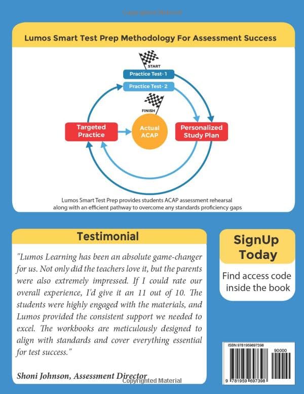 Alabama Comprehensive Assessment Program (ACAP) 4th Grade English Language Arts Workbook for Kids (Ages 9-10) Boost your child’s ACAP test scores using the Lumos Grade 4 English language Arts Test Prep Workbook. Crafted by expert educators, this workbook comprehensively covers over 40+ essential ELA skills tailored for fourth graders. Featuring a wide variety of standards-aligned practice questions, the Lumos ACAP workbook supports your child to enhance ELA proficiency through consistent daily and weekly practice, resulting in improved ACAP test scores. Why You’ll Love This 4th Grade ELA Book for 2023-24 ACAP Test Prep Excel in 40+ Essential ELA Skills: Master key ELA concepts including Reading: Literature, Reading: Informational Text, and Language. This comprehensive workbook fosters not just success in the Alabama state assessment, but also cultivates a robust academic groundwork. Boost State Test Success: Lumos ACAP test prep workbooks break free from traditional print workbooks. It features a wide variety of standards-aligned content in both print and online formats. Lumos Smart Test Prep Methodology: Unlock success on the Alabama Comprehensive Assessment Program (ACAP) powered by our proprietary Lumos Smart Test Prep Methodology. It provides simulated ACAP practice and remediation tools to overcome proficiency gaps. Replicated ACAP Practice: Access 2 full-length online practice tests mirroring the ACAP blueprint–question types, tech-enhanced items, duration, rigor of the standards, and more. Plus, the look and feel are the same as the actual ACAP computerized test, fostering comfort with the ACAP format, and boosting test readiness. Important Note: Once you register for the online program, the first practice test gets auto-assigned by Lumos Support. Personalized Study Plan for Targeted Remediation: Using your child’s performance data from the online ACAP-like practice tests, the online program generates a personalized study plan. This plan includes a checklist of standards tailored to your child’s needs, guiding them to improve with relevant practice questions from our workbook and online program. Track Your Child’s Progress and Growth: Gain valuable insights with an intuitive dashboard in the online program to monitor advancement and pinpoint strong and weak areas. About Lumos Learning Lumos Learning has been a trusted partner in providing state test preparation resources to parents and educators for over 16 years. With an impressive reach of over 1 million students, 125,000 teachers, and 44,000 schools, our proven study programs improve student outcomes in state assessments. Versatile and Flexible Learning Solution At-Home Learning Classroom Learning Home Tutoring & Home Schooling. Resources in the Print Workbook 3 chapters covering 40+ ELA skills Answer keys with detailed explanations Resources in the Online Program 2 full-length practice tests mirroring the ACAP blueprint Personalized study plan for targeted remediation Supplementary resources: solved examples, videos, and more User-friendly dashboard and performance reports for progress measurement Access ACAP Online Resources in 3 Easy Steps Scan the QR code or visit www.lumoslearning.com/a/tedbooks Enter the access code provided within the print workbook Provide basic details and get started! Grab your copy of the Lumos ACAP 4th-grade English Language Arts workbook today and boost your child’s Alabama state test scores!