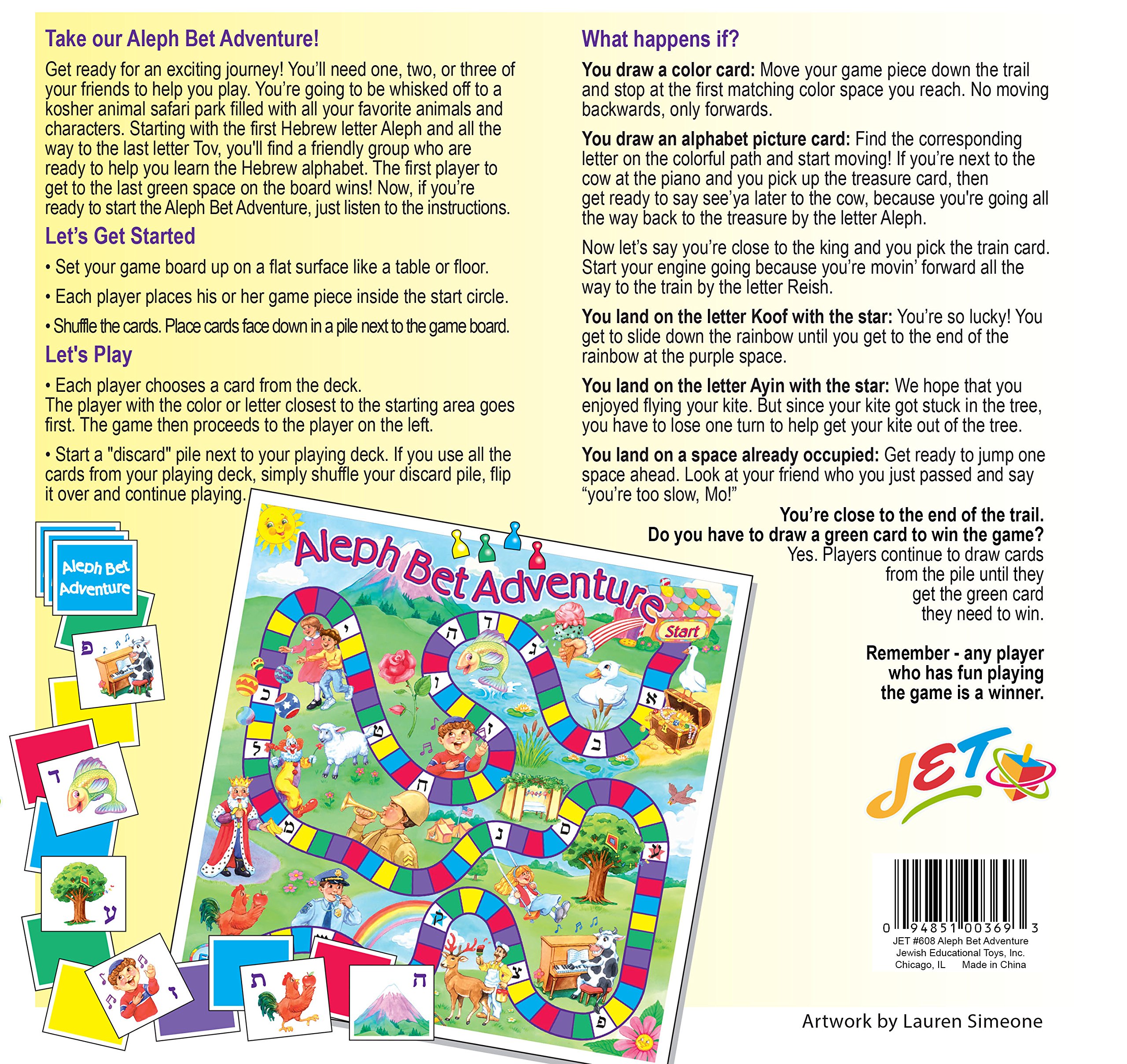 Learn the Aleph Bet! This fun and colorful board game provides early exposure to the Hebrew alphabet, and builds important beginning reading skills such as letter recognition, initial sounds, and more. No Reading Required. 2-4 Players. Ages 3 & Up.