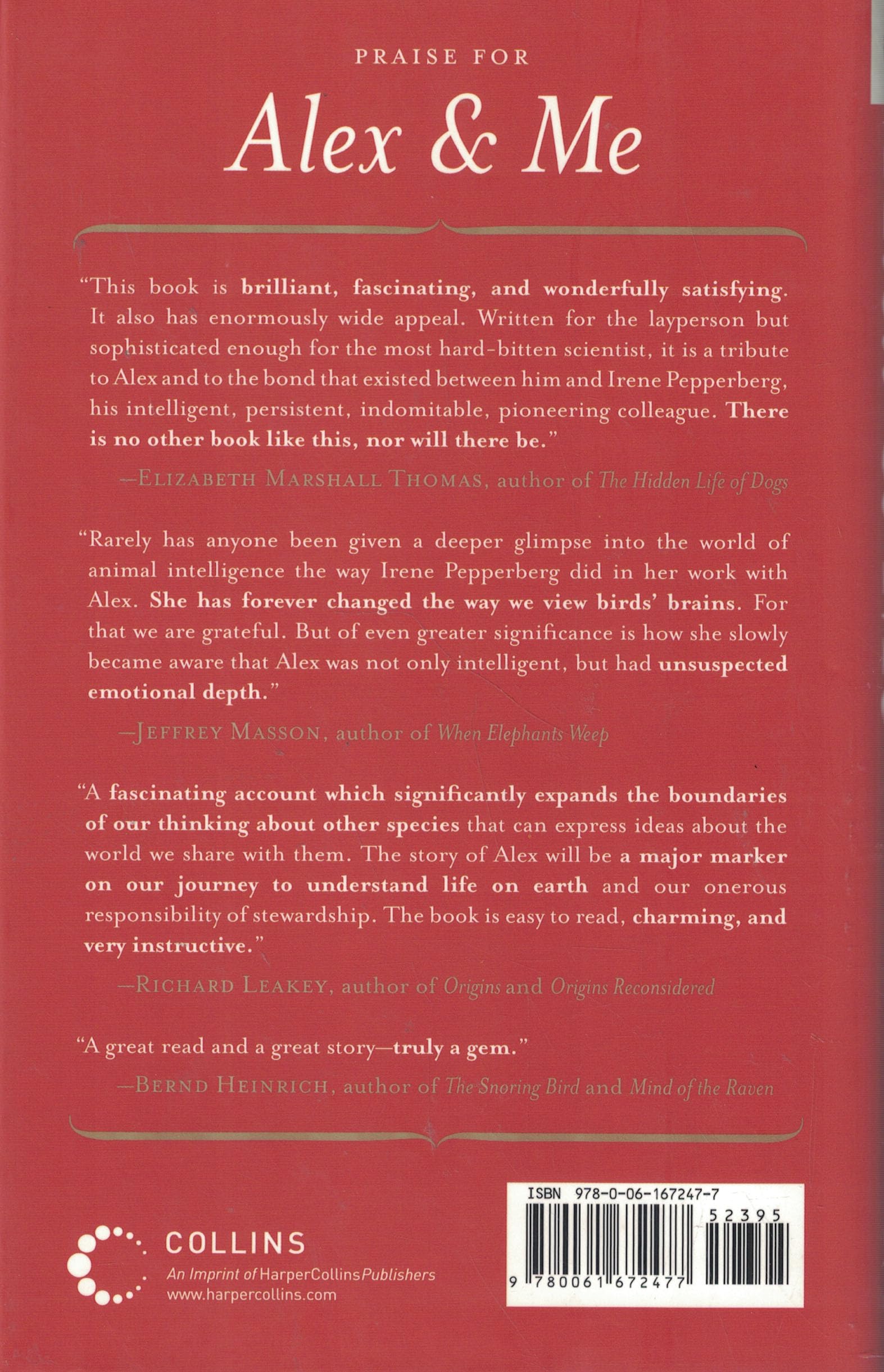 Alex & Me is the remarkable true story of an extraordinary relationship between psychologist Irene M. Pepperberg and Alex, an African Grey parrot who proved scientists and accepted wisdom wrong by demonstrating an astonishing ability to communicate and understand complex ideas. A New York Times bestseller and selected as one of the paper’s critic’sTop Ten Books of the Year, Alex & Me is much more that the story of an incredible scientific breakthrough. It’s a poignant love story and an affectionate remembrance of Pepperberg’s irascible, unforgettable, and always surprising best friend.