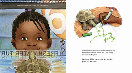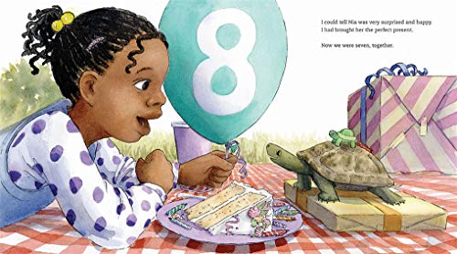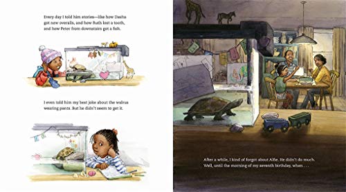 Discover the friendship between a girl and her turtle–from both points of view–in Thyra Heder’s Alfie, anaward-winning picture book that celebrates the relationship between a child and a pet. An ALA/ALSC Notable Children’s Book Nia loves Alfie, her pet turtle. But he’s not very soft, he doesn’t do tricks, and he’s pretty quiet. Sometimes she forgets he’s even there–that is, until the night before her seventh birthday, when . . . Alfie disappears! Where did he go? And why? Nia can’t say . . . but Alfie can. This is his story, and the narrative switches to Alfie’s perspective as the brave turtle goes on the hunt for the perfect gift for Nia’s birthday. He explores the house, encountering the family dog, then ventures out onto the fire escape, down into the yard, and through a sandbox until he grows cold and tired. A friendly snail suggests that Alfie take a nap in the pond in the yard. Young readers will see the passage of time through the change in seasons from fall to winter and then spring in colorful illustrations. Alfie wakes up from his nap and emerges from the pond in time to celebrate what Alfie believes is Nia’s seventh birthday. Readers will delight to see the two reunited and will notice that it is, actually, Nia’s eighth birthday, as the number indicates on her birthday balloon. Parents and their children will embrace this warm, colorful, and funny picture book that celebrates friendship, even when the friends see the relationship–and the world–very differently. “A charming story of the bond between child and pet.” –Booklist “Beautiful, expressive watercolor illustrations . . . A journey about what it means to be a child with a new pet.” –Kirkus Reviews (Starred Review)