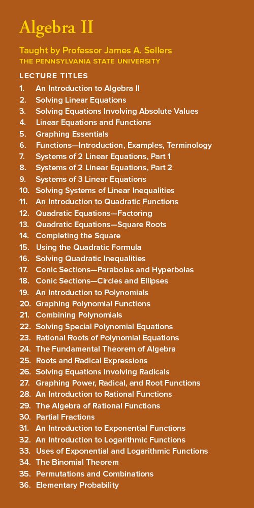 Algebra II is a deeply rewarding subject in its own right that goes well beyond the rudiments of signed numbers, symbols, and simple equations learned in Algebra I. These 36 engaging lectures give you the tools you need to thrive in a core skill of mathematics. An eloquent explainer of ideas, Professor Sellers shows that algebra can be an exciting intellectual adventure and not nearly as difficult as many students fear. Those who will benefit from this user-friendly approach include high-school students, home-schooled students, college students, math teachers, summer learners, and anyone curious about what underlies mathematics and science. As you solve problems with Professor Sellers, you’ll see that the ideas behind algebra – including functions, graphing, polynomials, conic sections, exponents and logarithms, and roots and radicals – are wonderfully interconnected. You’ll also learn to deploy an arsenal of formulas and theorems, including the vertical line test, the quadratic formula, the binomial theorem, and the change of base formula. This sense of ease and adventure in tackling the richly varied terrain of algebra characterizes the experience you will have with this superstar teacher and his lectures. You’ll learn to solve problems that look impossible at first glance, find that you enjoy them more than you ever thought possible, and look forward to even more challenging exploits as you continue your mathematics education.