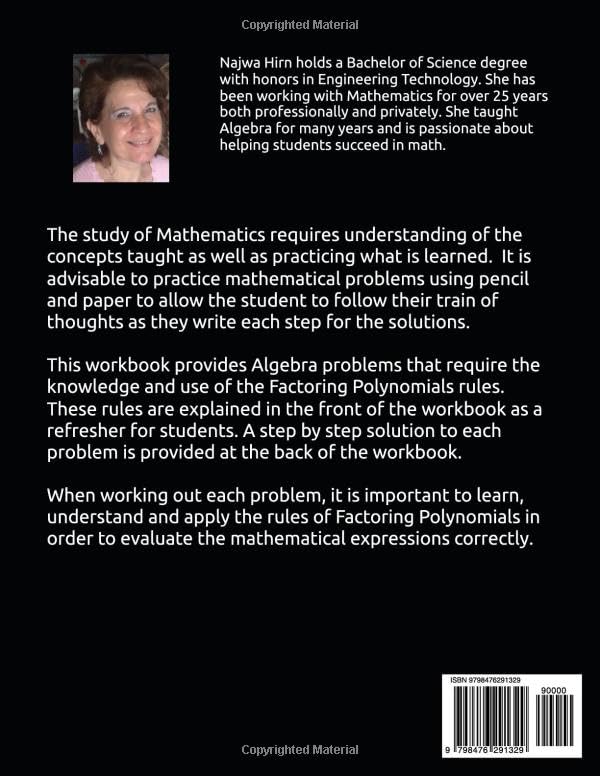 School is just around the corner. Grab your Algebra workbook here! Are you struggling with Algebra? Do you need an Algebra refresher? Do you need to practice your Algebra skills? Do you find that you have forgotten how to solve equations with one variable? If you answered yes to the questions above then this Algebra workbook is for you. The Key to learning Algebra is Practice and more Practice. This Algebra Workbook with answers is intended to be used as: An Algebra workbook for students enrolled in Prealgebra and Introductory Algebra classes. An Algebra workbook for adult students coming back to school. .An Algebra workbook for anyone needing to brush up on Prealgebra and Introductory Algebra problems. This workbook provides Algebra Factoring Polynomials practice problems with an answer key and step by step solutions. The workbook starts with simple algebra problems then progresses to harder problems. Grab your paperback or ebook copy today!