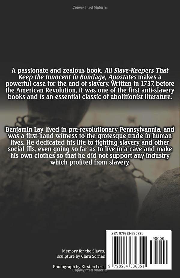 This professionally-presented edition has been thoroughly proofread and has good margins and a font size that is easy on the eyes. A passionate and zealous book which was a searing indictment of the slavekeeping classes of 18th-century America. Benjamin Lay, a Quaker abolitionist, exposes the hypocrisy of slaveholders who profess to follow Christ, yet keep their fellow human beings in bondage. Written in 1737, before the American Revolution, All Slavekeepers Who Keep the Innocent in Bondage, Apostates was one of the first anti-slavery books and is an essential classic of abolitionist literature. Benjamin Lay lived in pre-revolutionary Pennsylvannia, and was a first-hand witness to the grotesque trade in human lives. He dedicated his life to fighting slavery and other social ills, even going so far as to live in a cave and make his own clothes so that he did not support any industry which profited from slavery.