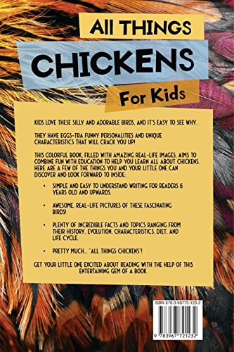 Treat the Little Chicken Fan in Your Life With A Book That Will Have Them CLUCK CLUCK CLUCKING for more! Kids love these silly and adorable birds, and it’s easy to see why. They have EGGS-tra funny personalities and unique characteristics that will CRACK you up! This colorful book, filled with amazing real-life images, aims to combine fun with education to help you learn all about chickens. Here are a few of the things you and your little one can discover and look forward to inside: Simple and easy to understand writing for readers 6 years old and upwards. Awesome, real-life pictures of these fascinating birds! Plenty of incredible facts and topics ranging from their history, evolution, characteristics, diet, and life cycle. Pretty much… “ALL THINGS CHICKENS”! Get your little one excited about reading with the help of this entertaining gem of a book!