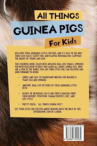 Treat the Little Guinea Pig Fan in Your Life With a Book That Will Make Them SQUEAK With Delight! Kids love these adorable little critters, and it’s easy to see why. Their cute faces, fluffy fur, and playful personalities captivate the hearts of young and old! This colorful book, filled with amazing real-life images, combines fun with education to help you learn all about guinea pigs. Here are a few of the things you and your little one can discover and look forward to inside: Simple and easy to understand writing for readers 6 years old and upwards. Awesome, real-life pictures of these adorable little pets! Plenty of incredible facts and topics ranging from their history, evolution, characteristics, diet, and life cycle. Pretty much… “ALL THINGS GUINEA PIGS”! Get your little one excited about reading with the help of this entertaining gem of a book!