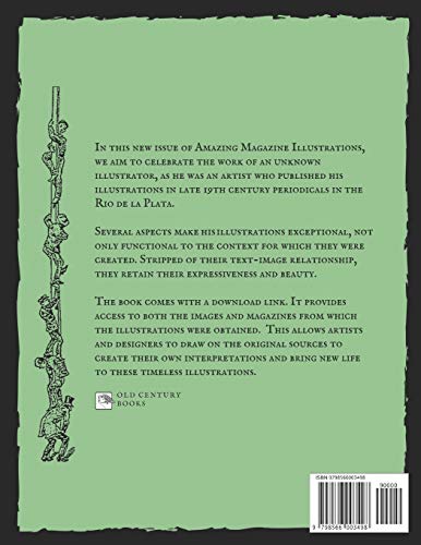 * The visual culture of the nineteenth-century * In this new issue of Amazing Magazine Illustrations, we aim to celebrate the work of an unknown illustrator, as he was an artist who published his illustrations in late 19th century periodicals in the Rio de la Plata. Several aspects make his illustrations exceptional, not only functional to the context for which they were created. Stripped of their text-image relationship, they retain their expressiveness and beauty, leaving intact their Wham! factor, a concept proposed by Jaleen Grove in his essay “Evaluating Illustrations Aesthetically”: “Visual communication is intended to make you feel something, and feel it strongly, whether it be to make you laugh, shame you into action, horrify, titillate, or put you at ease. The power of the in-the-gut Wham! is what makes people bond with the image, and it is one measure of an illustration’s success. Don’t be ashamed to fall in love with something corny, gory, sexy, sentimental, funny–the seductiveness, delicious creepiness, guilty pleasure, or what have you is exactly what makes the work relevant and desirable; what makes you identify with it or recoil in horror. How successful –and how beneficial or dangerous– is that?” This book gathers 100 black and white illustrations. The illustrations were processed with an Ink Sketch effect to highlight the lines of the drawings and remove color saturation. The objective is not to achieve high-quality images, but it responds to an aesthetic intention. The book comes with a download link. It provides access to both the images and magazines from which the illustrations were obtained. This allows artists and designers to draw on the original sources to create their own interpretations and bring “new life” to these timeless illustrations. Product Details: Large format (8.5 x 11 inches). Paper: white paper – 60lb / 90 GSM. Premium matte-finish cover design. Illustrations were selected and reproduced directly from rare and unique 19th-century sources. Download Included: The book comes with a unique download link providing instant access to all images featured. About Old Century Books is a small and Indie Publishers. We love selecting and reproducing old illustrations from rare and unique 19th-century sources. We find joy in rescuing and re-interpreting the works of great artists, many of them anonymous, but who left their mark on works that transcend the frontier of time and its context. With each book we publish, our goal is that our readers will find in these works a source of inspiration that will encourage his creativity, giving new life to these timeless illustrations. https://oldcenturybooks.weebly.com