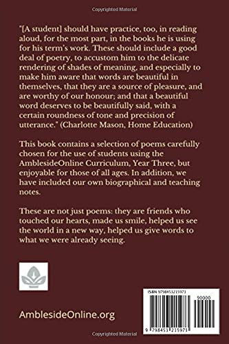“[A student] should have practice, too, in reading aloud, for the most part, in the books he is using for his term’s work. These should include a good deal of poetry, to accustom him to the delicate rendering of shades of meaning, and especially to make him aware that words are beautiful in themselves, that they are a source of pleasure, and are worthy of our honour; and that a beautiful word deserves to be beautifully said, with a certain roundness of tone and precision of utterance.” (Charlotte Mason, Home Education) This book contains a selection of poems carefully chosen for the use of students using the AmblesideOnline Curriculum, Year Three, but enjoyable for those of all ages. In addition, we have included our own biographical and teaching notes. These are not just poems: they are friends who touched our hearts, made us smile, helped us see the world in a new way, helped us give words to what we were already seeing.