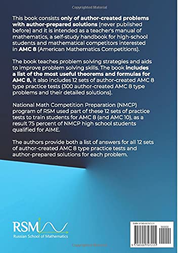This book consists only of author-created problems with author-prepared solutions and it is intended as a teacher’s manual of mathematics, a self-study handbook for high-school students and mathematical competitors interested in American Mathematics Competitions (especially AMC 8). The book teaches problem solving strategies and aids to improve problem solving skills. The book includes a list of the most useful theorems and formulas for AMC 8, it also includes 12 sets of author-created AMC 8 type practice tests (300 author-created AMC 8 type problems and their detailed solutions). National Math Competition Preparation (NMCP) program of RSM used part of these 12 sets of practice tests to train students for AMC 8 (and AMC 10), as a result 75 percent of NMCP high school students qualified for AIME. The authors provide both a list of answers for all 12 sets of author-created AMC 8 type practice tests and author-prepared solutions for each problem. About the authors: Hayk Sedrakyan is an IMO medal winner, professional mathematical Olympiad coach in greater Boston area, Massachusetts, USA. He has been the dean (and one of the main developers) of one of the biggest math competition preparation programs in the USA. He has been a Professor of mathematics in Paris and has a PhD in mathematics (optimal control and game theory) from the Sorbonne University (UPMC), Paris, France. He is a Doctor of mathematical sciences in USA, France, Armenia and holds three master’s degrees in mathematics from institutions in Germany, Austria, Armenia and has spent a small part of his PhD studies in Italy. Hayk Sedrakyan has worked as a scientific researcher for the European Commission (sadco project), has been one of the Team Leaders at Harvard-MIT Mathematics Tournament (HMMT) and was an invited speaker at the Imperial College London. He took part in the International Mathematical Olympiads (IMO) in the United Kingdom, Japan and Greece. He has been elected as the President of the general assembly and a member of the management board of the Cite Internationale Universitaire de Paris (10,000 students, 162 different nationalities) and the same year they were nominated for the Nobel Prize. He is the son and was one of the students of Nairi Sedrakyan. Nairi Sedrakyan is the winner of one of the highest international awards in mathematics (Erdos Award 2022). For contributing to the development of mathematics worldwide. He is involved in national and international Mathematics Olympiads having been the President of Armenian Mathematics Olympiads and a member of the IMO problem selection committee. He is the author of one of the most difficult problems ever proposed in the International Mathematical Olympiad, the 5th problem of the 37th IMO. This problem is considered to be one the hardest problems in the IMO as none of the members of the strongest teams (national Olympic teams of China, USA, Russia) succeeded to solve it correctly, and because national Olympic team of China (the strongest team in the IMO) obtained a cumulative result of 0 points and was ranked 6th in the final ranking of the countries instead of the usual 1st or 2nd place. The British 2014 lm X+Y, released in the USA as A Brilliant Young Mind, inspired by the film Beautiful Young Minds (focuses on an English mathematical genius chosen to represent the United Kingdom at the IMO) also states that this problem is the hardest problem ever proposed in the history of the IMO (minutes 9:40-10:30). Nairi Sedrakyan’s students have received 20 medals in the International Mathematical Olympiad, including Gold and Silver medals. Nairi Sedrakyan received a Gold Medal for his contributions to World’s Mathematical Olympiads and Scientific Activities. AMC is American Mathematics Competitions by MAA, which is not affiliated with this book. All rights reserved. No part of this book may be used or reproduced in any manner without the written permission.