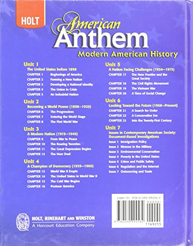 American Anthem, Modern American History: UNIT1 – The United States Before 1898 …… UNIT 2 – Becoming A World Power (1898-1920) …… UNIT 3 – A Modern Nation (1919-1940) …….. UNIT 4 – A Champion of Democracy (1939-1960) ……… UNIT 5 – A Nation Facing Challenges (1954-1975) ………. UNIT 6 – Looking Toward The Future (1968-Present) ……. UNIT 7 – Issues in Contemporary America Society: Document-Based Investigation