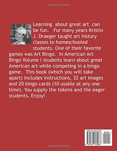 The bingo game can be used as a standalone game. However, it is also meant to be used in conjunction with American Art History, Volume I and Drawing American Art, Volume I also by Kristin J. Draeger. Learning about great art can be fun. In this first volume of American Art Bingo students will learn about: Prehistoric Art Mound Builder Art Desert Southwest Art Iroquois Art Taino Art The Art of John White Early Virginian Art Colonial Portraiture Spanish Missions John Singleton Copley Paul Revere Benjamin West Charles Wilson Peale Raphael Peale Gilbert Stuart Joshua Johnson Architecture (White House & Capitol Building) This book contains 32 images and 20 bingo cards (10 usable at any one time) and instructions. This is a disposable book. I.e. What you’ll have to do is rip the pages out…..I mean carefully cut out the pages and either use them as is or protect them in someway (protective covers, lamination, etc).