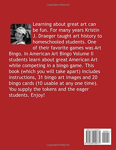 The bingo game can be used as a standalone game. However, it is also meant to be used in conjunction with American Art History, Volume II and Drawing American Art, Volume II also by Kristin J. Draeger. Learning about great art can be fun. In this second volume of American Art Bingo students will learn about: Thomas Cole John James Audubon Edward Hicks Ammi Phillips George Catlin George Caleb Bingham Frederic Remington Winslow Homer James McNeil Whistler Thomas Eakins John Singer Sargent Mary Cassatt Edward Hopper Max Weber Dorothy Lange Georgia O’Keeffe. This book contains 31 images and 20 bingo cards (10 usable at any one time) and instructions. This is a disposable book. I.e. What you’ll have to do is rip the pages out…..I mean carefully cut out the pages and either use them as is or protect them in someway (protective covers, lamination, etc).