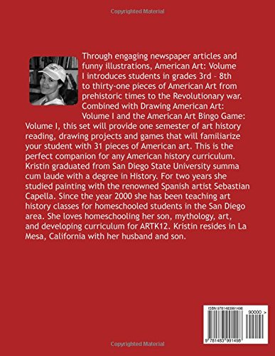 The art history curriculum is designed to be used once a week for a 16 week semester; each week’s lesson takes about 2 hours and is very easy to teach – very little preparation involved. There are three books for each semester. You simply: Play the bingo game (American Art Bingo Vol. I Purchased separately) Read the chapter in American Art History Vol. I) Draw the piece of art (Drawing American Vol. I) Purchased separately Only one set is needed per family. Each chapter includes two Forgery games at the end. The games are simple: compare the real work of art to the “forgery” on the facing page and try to find ten differences. This game can be played by students individually or as a group in a classroom setting. In a group students often enjoy competing against each other to see who can find all ten differences first.The game allows children to enjoy studying art, and entices them to thoroughly examine each work of art. By spending time comparing two images, students spend time studying the art in close detail. This volume contains: Prehistoric Art Mound Builder Art Native Southwestern Art Iroquois Art> Taino Art John White Early Virginian Art Colonial Portraiture Matthew Pratt Spanish Colonial Architecture Benjamin West John Singleton Copley Paul Revere Charles Wilson Peale Raphael Peale Gilbert Stuart