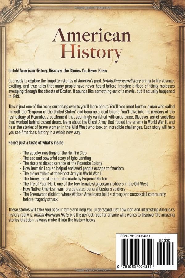 Untold American History: Discover the Stories You Never Knew Get ready to explore the forgotten stories of America’s past. Untold American History brings to life strange, exciting, and true tales that many people have never heard before. Imagine a flood of sticky molasses sweeping through the streets of Boston. It sounds like something out of a movie, but it actually happened in 1919. This is just one of the many surprising events you’ll learn about. You’ll also meet Norton, a man who called himself the “Emperor of the United States” and became a local legend. You’ll dive into the mystery of the lost colony of Roanoke, a settlement that seemingly vanished without a trace. Discover secret societies that worked behind closed doors, learn about the Ghost Army that fooled the enemy in World War II, and hear the stories of brave women in the Wild West who took on incredible challenges. Each story will help you see America’s history in a whole new way. Here’s just a taste of what’s inside: The spooky meetings of the Hellfire Club The sad and powerful story of Igbo Landing The rise and disappearance of the Roanoke Colony How Jermain Loguen helped enslaved people escape to freedom The clever tricks of the Ghost Army in World War II The funny and strange rules made by Emperor Norton The life of Pearl Hart, one of the few female stagecoach robbers in the Old West How Native American warriors defeated General Custer’s soldiers The Greenwood district, where African Americans built a strong and successful community before tragedy struck These stories will take you back in time and help you understand just how rich and interesting America’s history really is. Untold American History is the perfect read for anyone who wants to discover the amazing stories that don’t always make it into the history books. Ready to learn more about America’s hidden past? Scroll up and click the “add to cart” button to start your adventure!