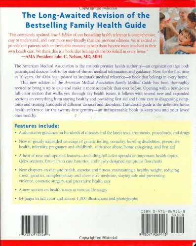The Long-Awaited Revision of the Bestselling Family Health Guide “This completely updated fourth edition of our bestselling health reference is comprehensive, easy to understand, and even more user-friendly than the previous editions. We’re excited to provide our patients with an invaluable resource to help them become more involved in their own health care. We think this is a book that belongs on the bookshelf in every home.”–AMA President John C. Nelson, MD, MPH The American Medical Association is the nation’s premier health authority-an organization that both patients and doctors look to for state-of-the-art medical information and guidance. Now, for the first time in 10 years, the AMA has updated its landmark medical reference-a book that belongs in every home. This new edition of the American Medical Association Family Medical Guide has been thoroughly revised to bring it up to date and make it more accessible than ever before. Opening with a brand-new full-color section that walks you through key health issues, it follows with several new and expanded sections on everything from staying healthy and providing first aid and home care to diagnosing symptoms and treating hundreds of different diseases and disorders. This classic guide is the definitive home health reference for the twenty-first century-an indispensable book to keep you and your loved ones healthy. * Authoritative guidance on hundreds of diseases and the latest tests, treatments, procedures, and drugs * New or greatly expanded coverage of genetic testing, sexuality, learning disabilities, preventive health, infertility, pregnancy and childbirth, substance abuse, home caregiving, and first aid * A host of new and updated features-including full-color spreads on important health topics, Q&A sections, first-person case histories, and newly designed symptoms flowcharts * New chapters on diet and health, exercise and fitness, maintaining a healthy weight, reducing stress, genetics, complementary and alternative medicine, staying safe and preventing violence, cosmetic surgery, and preventive health care * A new section on health issues at various life stages * 64 pages in full color and almost 1,000 illustrations and photographs