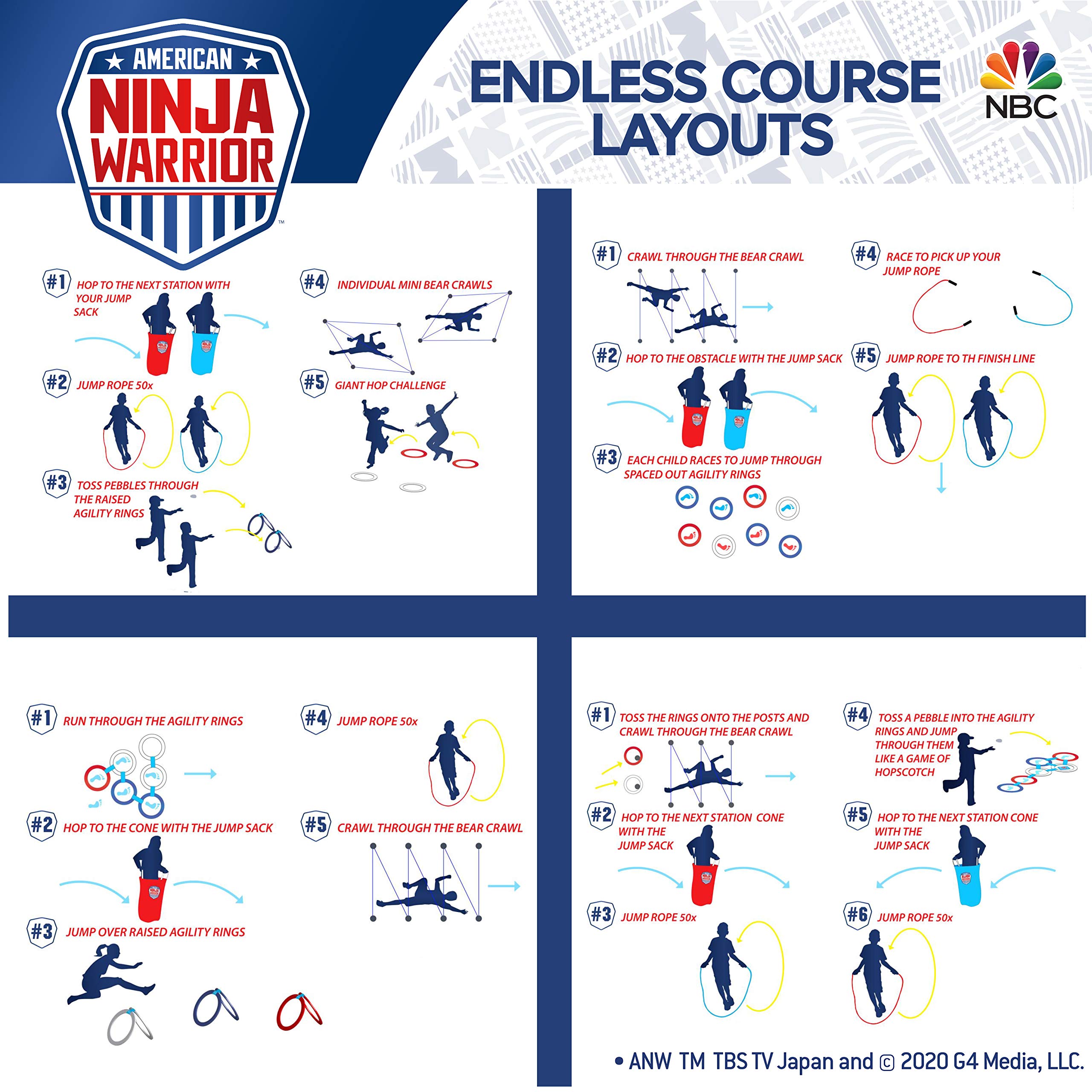 - Head-to-head, team or timed competition! Includes 2 hop sacks, 2 jump ropes, 8 agility rings with connectors, bear crawl Use the suggested course set-ups or create your own!