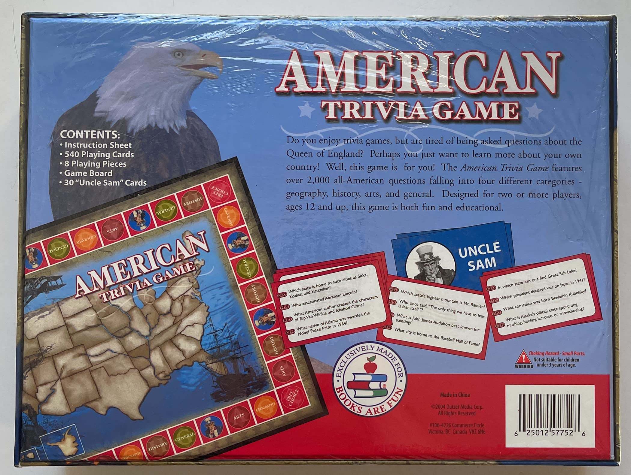 Do you enjoy trivia games, but are tired of being asked questions about the Queen of England? Perhaps you just want to learn more about your own country! Well, this game is for you! The American Trivia Game features over 2,000 all-American questions falling into four different categories – geography, history, arts, and general. Designed for two or more players, ages 12 and up, this game is both fun and educational. Contents: 540 Playing Cards, 8 Playing Pieces, Game Board, and Instructions. 30 “Uncle Sam” Cards