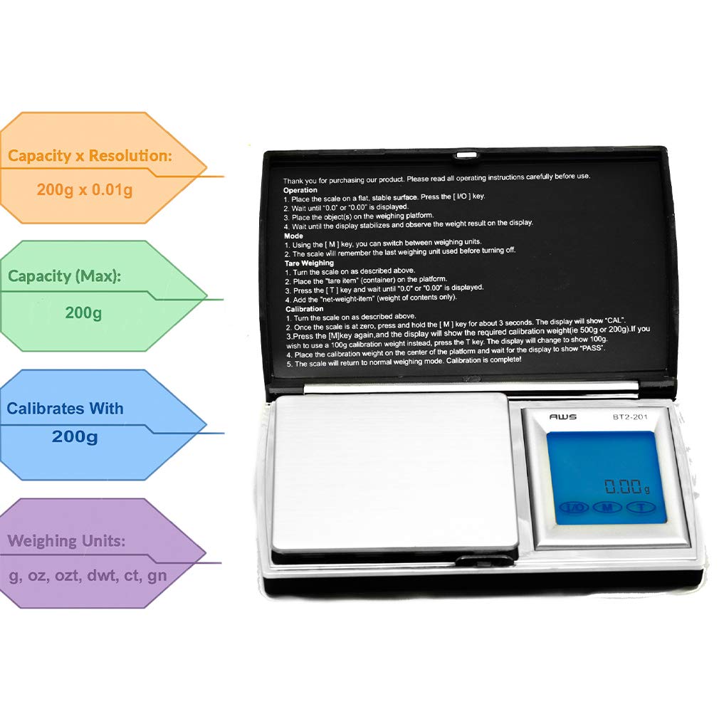 - PRECISE MEASUREMENT: The AMW-BT2-201 has a capacity of 200g x 0.01 offering accurate and precision with every weigh. Tried and true measuring while offering a modern and easy to use scale. Our scale offers all weighing units in a rainbow of color changing modes to be ever so easy on the eyes even in dim lighting. OVER 20 YEARS of experience in manufacturing the most reliable scales on the market.