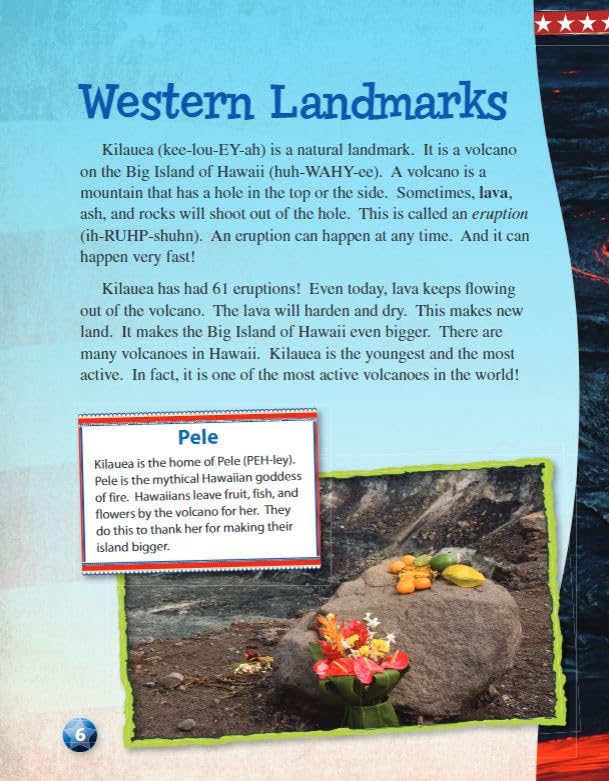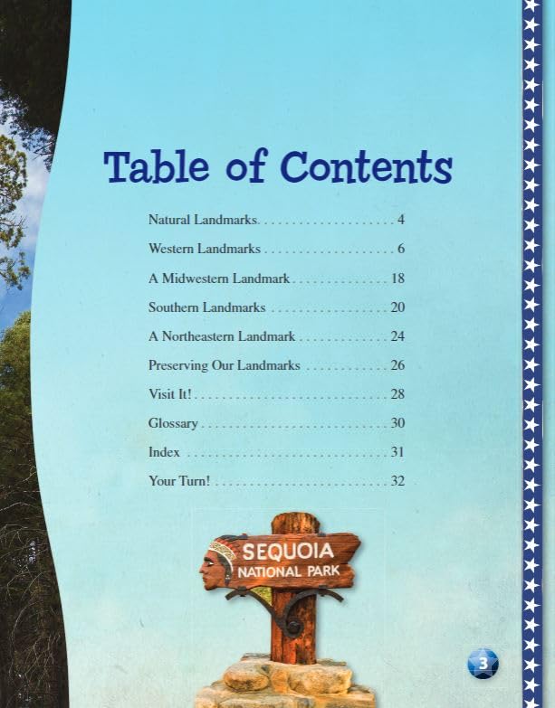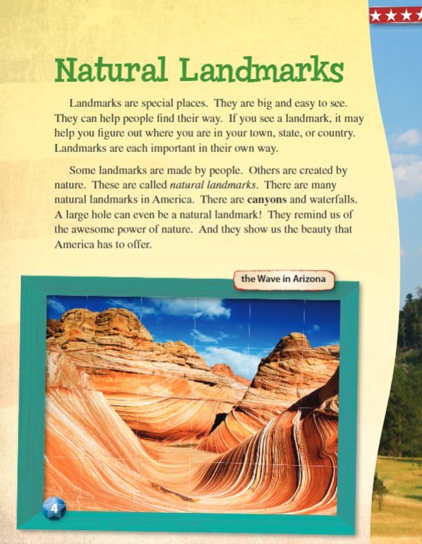 Introduce students to some of America’s most famous natural landmarks! Students will learn about unique and beautiful places like Glacier Bay, Kilauea, Mesa Arch, Sequoia National Park, and more. Readers will also learn the importance of remembering the past and preserving these landmarks. Colorful images, supporting text, a glossary, table of contents, and index all work together to engage readers and help them better understand the content. This informative, colorful book uses primary sources to captivate readers as they learn social studies topics.