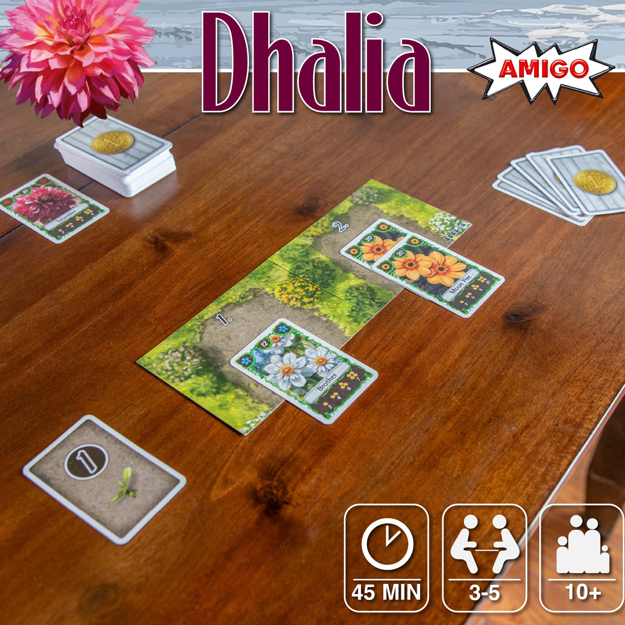 Experience the vibrant world of Bohnanza: Dahlias, a special edition of the classic Bohnanza card game, now with a floral twist. Designed for 3-5 players, this game offers hours of strategic fun for game nights and gatherings. In Bohnanza: Dahlias, each player starts with a hand of random flower cards that cannot be rearranged, adding a unique challenge. Plant the first one or two cards in your fields, each holding only one flower type. Trade cards with other players to optimize your fields, adding a strategic layer to the game. Harvest flowers to earn coins, flipping 1-4 cards from your field to transform them into currency. Play through the deck three times, with a final harvest determining the winner by the most coins collected. Simple yet deep, Bohnanza: Dahlias is easy to learn but offers rich strategic play. Beautifully illustrated cards and high-quality components ensure an enjoyable experience every time. Whether new or experienced, Bohnanza: Dahlias is a must-have for your collection. Plant, trade, and harvest your way to victory in this engaging card game! Amigo Games is a renowned publisher celebrated for its diverse and high-quality selection of board and card games. Known for creating engaging, easy-to-learn games, Amigo Games offers a wide range of family-friendly and strategic titles that bring joy to players of all ages, fostering social interaction and fun worldwide.