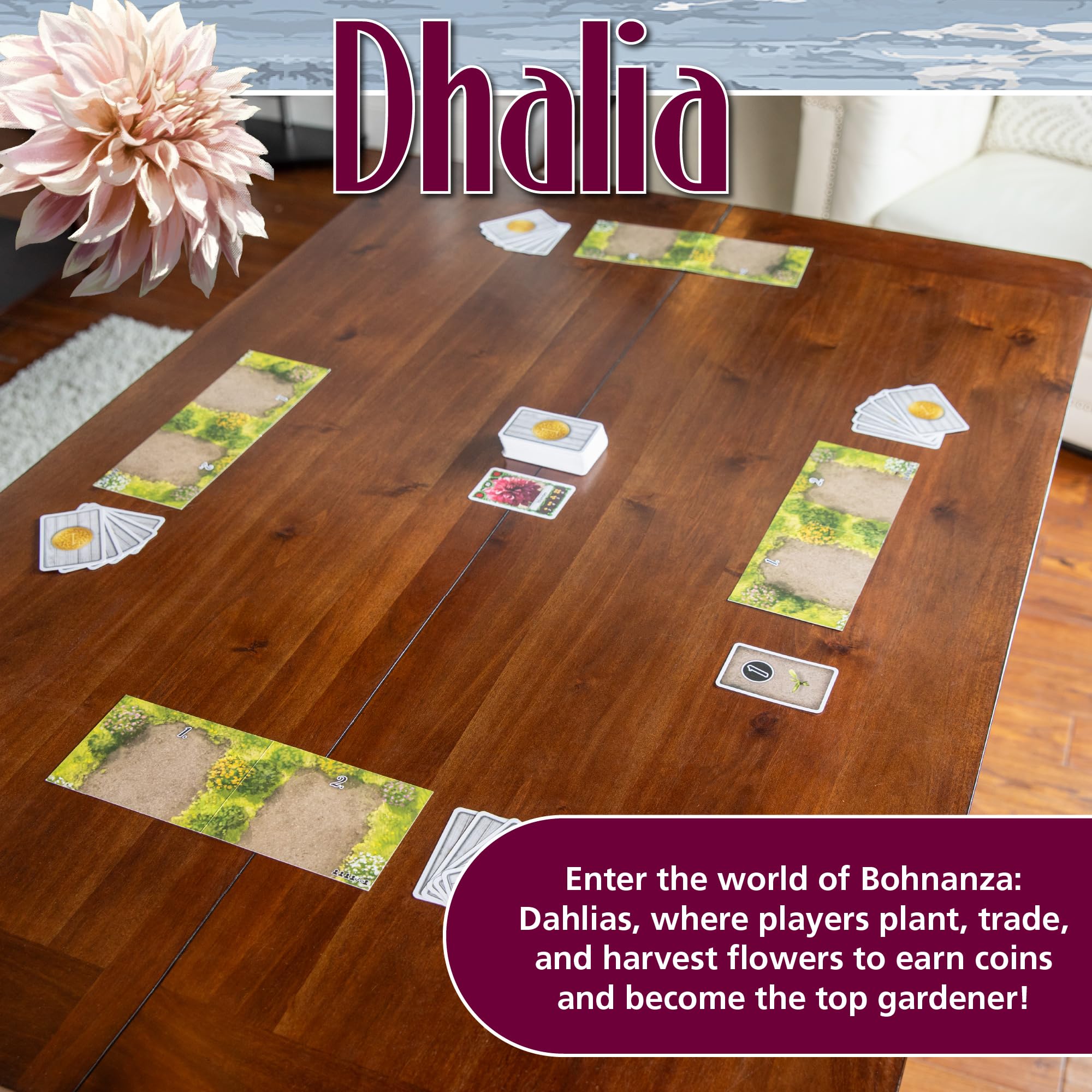 - Beautiful Flower-Themed Fun: Immerse yourself in the delightful world of Bohnanza: Dahlias, where players compete to plant, trade, and harvest the most stunning flowers to earn coins and become the ultimate gardener!