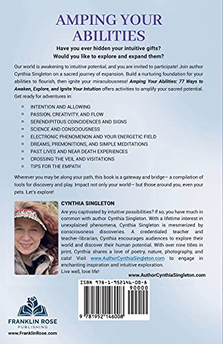 Have you ever hidden your intuitive gifts? Would you like to explore and expand them? Our world is awakening to intuitive potential, and you are invited to participate! Join author Cynthia Singleton on a sacred journey of expansion. Build a nurturing foundation for your abilities to flourish, then ignite your miraculousness! Amping Your Abilities: 77 Ways to Awaken, Explore, and Ignite Your Intuition offers activities to amplify your sacred potential. Get ready for adventures in: INTENTION AND ALLOWING PASSION, CREATIVITY, AND FLOW SERENDIPITOUS COINCIDENCES AND SIGNS SCIENCE AND CONSCIOUSNESS ELECTRONIC PHENOMENON AND YOUR ENERGETIC FIELD DREAMS, PREMONITIONS, AND SIMPLE MEDITATIONS PAST LIVES AND NEAR DEATH EXPERIENCES CROSSING THE VEIL AND VISITATIONS TIPS FOR THE EMPATH Wherever you may be along your path, this book is a gateway and bridge– a compilation of tools for discovery and play. Impact not only your world– but those around you, even your pets. Let’s explore!