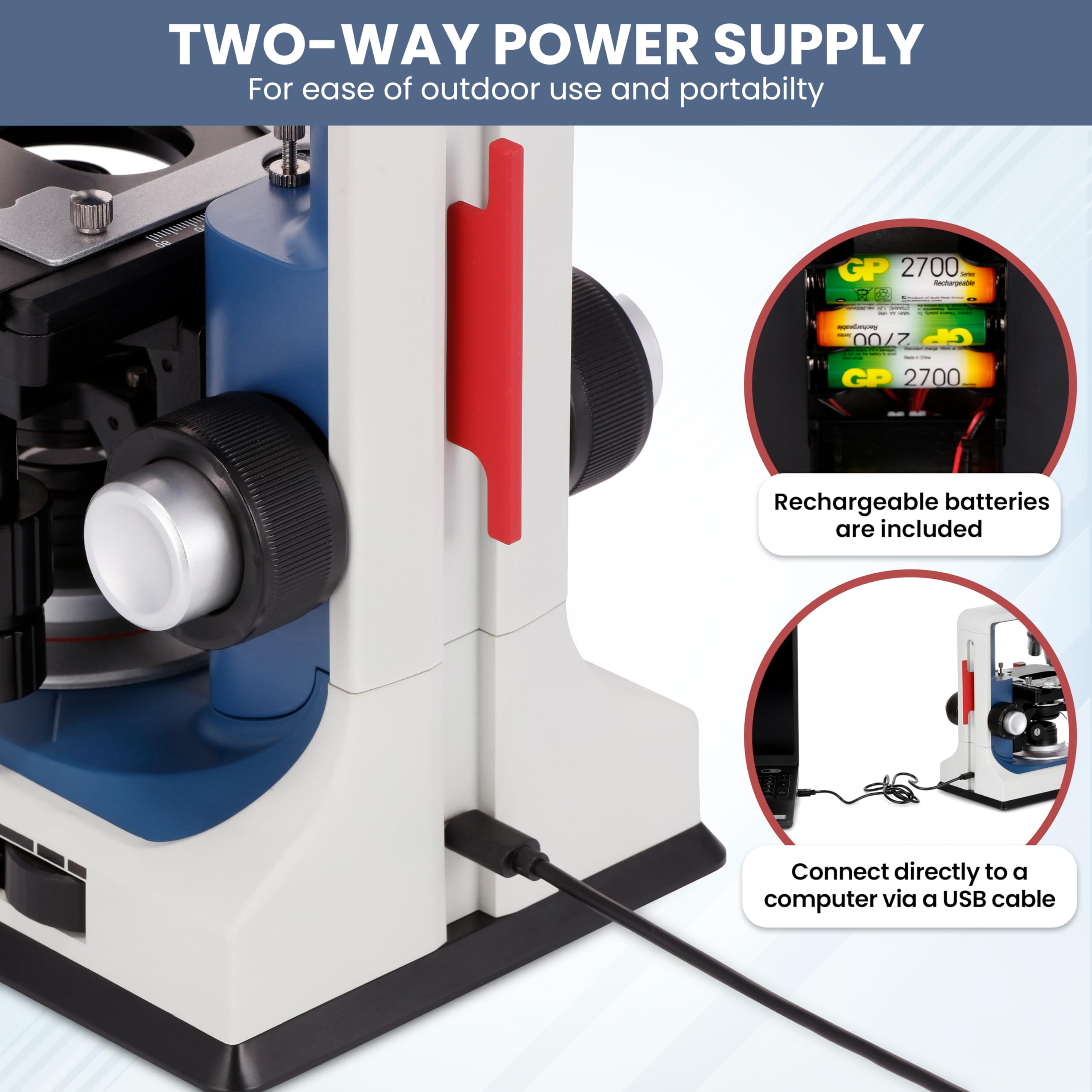 - NEWLY DESIGNED: The B120C-R Binocular Compound Microscope includes updated quality-of-life features such as dual power with Universal USB-C to USB and included AA rechargeable batteries.