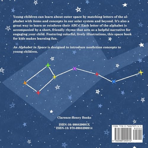 Spark curiosity and wonder with a journey through outer space in this colorful space alphabet book for kids ages 2-5. Young children can learn about outer space by matching letters of the alphabet with items and concepts in our solar system and beyond. It’s also a great way to learn or reinforce their ABCs! Each letter of the alphabet is accompanied by a short, friendly rhyme that acts as a helpful narrative for engaging your child. Featuring colorful, lively illustrations, this space book for kids makes learning fun. An Alphabet in Space is designed to introduce nonfiction concepts to young children. Take a journey through space today!