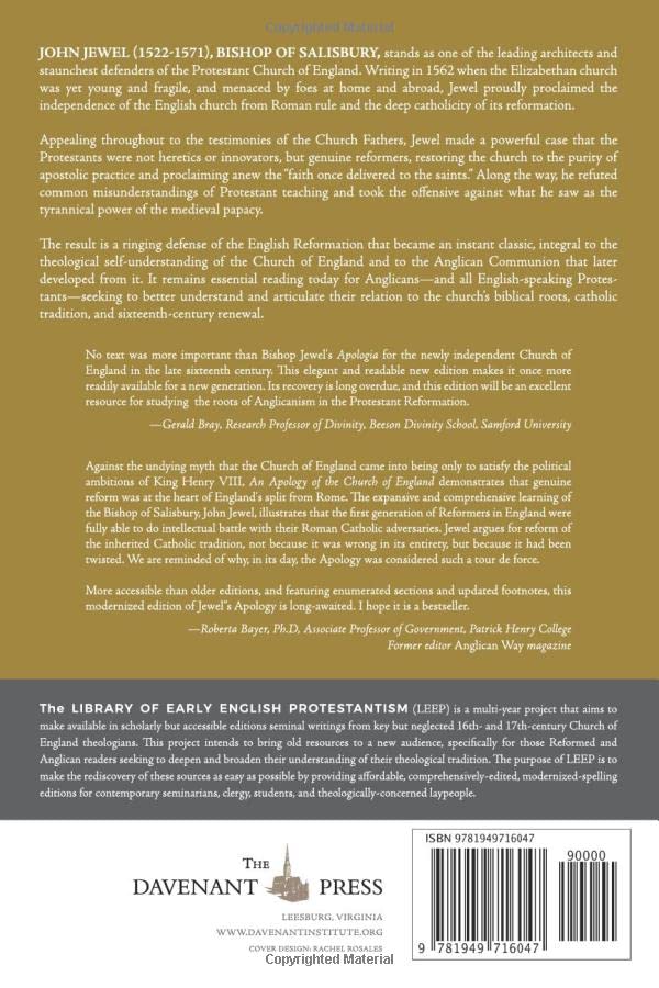 John Jewel (1522-1571), Bishop of Salisbury, stands as one of the leading architects and perhaps the staunchest defender of the Protestant Church of England. Writing in 1562 when the Elizabethan church was yet young and fragile, and menaced by Catholic foes at home and abroad, Jewel proudly proclaimed the independence of the English church from Roman rule, and the deep catholicity of its reformation.Appealing throughout to the testimonies of the Church Fathers, Jewel made a powerful case that the Protestants were not heretics or innovators, but genuine reformers, restoring the church to the purity of apostolic practice and proclaiming anew the “faith once delivered to the saints.” Along the way, he refutes common misunderstandings or caricatures of Protestant teaching, and takes the offensive against what he sees as the tyrannical power of the medieval papacy.The result is a ringing defense of the English Reformation that became an instant classic, integral to the theological self-understanding of the Church of England and to the Anglican Communion that later developed from it. It remains essential reading today for Anglicans–or any English-speaking Protestants–seeking to better understand and articulate their relation to the church’s biblical roots, catholic tradition, and sixteenth-century renewal.