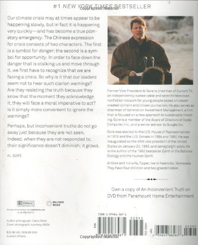 An Inconvenient Truth–Gore’s groundbreaking, battle cry of a follow-up to the bestselling Earth in the Balance–is being published to tie in with a documentary film of the same name. Both the book and film were inspired by a series of multimedia presentations on global warming that Gore created and delivers to groups around the world. With this book, Gore, who is one of our environmental heroes–and a leading expert–brings together leading-edge research from top scientists around the world; photographs, charts, and other illustrations; and personal anecdotes and observations to document the fast pace and wide scope of global warming. He presents, with alarming clarity and conclusiveness–and with humor, too–that the fact of global warming is not in question and that its consequences for the world we live in will be disastrous if left unchecked. This riveting new book–written in an accessible, entertaining style–will open the eyes of even the most skeptical.
