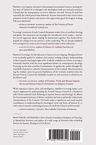 Contemporary scholars often refer to “the event of Vatican II,” but what kind of an event was it? In this first book of the new CUA Press series Sacra Doctrina, Matthew Levering leads his readers to see the Council as a “theological event”–a period of confirming and continuing God’s self-revelation in Christ into a new historical era for the Church. This is an introduction to Vatican II with a detailed summary of each of its four central documents–the dogmatic constitutions–followed by explanations of how to interpret them. In contrast to other introductions, which pay little attention to the theological soil in which the documents of Vatican II germinated, Levering offers a reading of each conciliar Constitution in light of a key theological author from the era: Rene Latourelle, SJ for Dei Verbum (persons and propositions); Louis Bouyer, CO for Sacrosanctum Concilium (active participation); Yves Congar, OP for Lumen Gentium (true and false reform); and Henri de Lubac, SJ for Gaudium et Spes (nature and grace). This theological event is “ongoing,” Levering demonstrates, by tracing in each chapter the theological debates that have stretched from the close of the council till the present, and the difficulties the Church continues to encounter in encouraging an ever deeper participation in Jesus Christ on the part of all believers. In this light, the book’s final chapter compares the historicist (Massimo Faggioli) and Christological (Robert Imbelli) interpretations of Vatican II, arguing that historicism can undermine the Council’s fundamental desire for a reform and renewal rooted in Christ. The conclusion addresses the concerns about secularization and loss of faith raised after the Council by Henri de Lubac, Joseph Ratzinger, and Yves Congar, arguing that contemporary Vatican II scholarship needs to take these concerns more seriously.