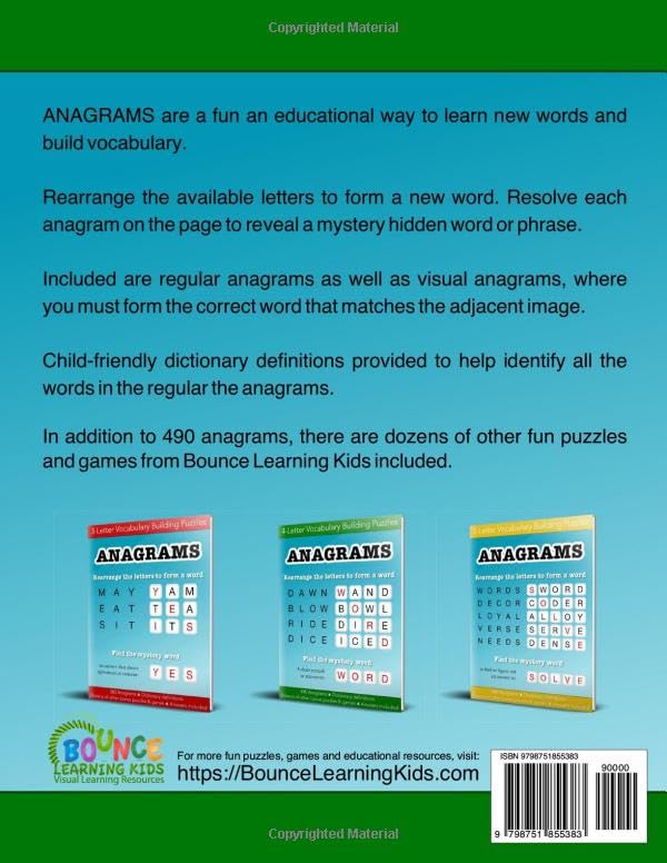 Unlock the Magic of Words with Anagrams – A Fun and Educational Puzzle Book Series! Looking for a captivating and educational activity to inspire your child or student? The Anagrams Puzzle Book Series is the perfect choice! Designed for younger audiences, this exciting series includes three books: 3-Letter Anagrams, 4-Letter Anagrams, and 5-Letter Anagrams, each packed with brain-teasing fun and valuable learning opportunities. Each book is carefully structured to keep young minds engaged: Anagram Puzzles with a Twist: Solve several anagrams on each page using helpful hints. Every solution reveals a highlighted letter–put them together to uncover a hidden bonus word! Engaging Variety: After every 8 pages of anagram puzzles, enjoy 2 pages of visual anagram challenges and 2 pages of other exciting puzzles, adding variety and keeping the fun alive. Track Your Progress: Handy progress charts at the front let kids mark off completed pages, building confidence and encouraging a sense of achievement. Complete Solutions Included: All answers are provided at the back, making this book perfect for independent learning or guided play. Why Parents and Teachers Love This Series: Boosts Vocabulary: Expands word knowledge and reinforces spelling in a playful, engaging way. Enhances Problem-Solving Skills: Encourages logical thinking, pattern recognition, and creativity. Fosters a Love of Learning: Turns wordplay into a fun, screen-free activity that feels like play, not work. Keeps Kids Motivated: Bonus words and progress charts create rewarding moments of discovery and accomplishment. Whether at home or in the classroom, the Anagrams Puzzle Book Series offers hours of enriching entertainment that kids will love. It’s a great way to combine learning with play while giving them the tools to build confidence and sharpen their minds. Order now and make learning a fun adventure for your child or student! Grab your copy today and unlock the magic of words!