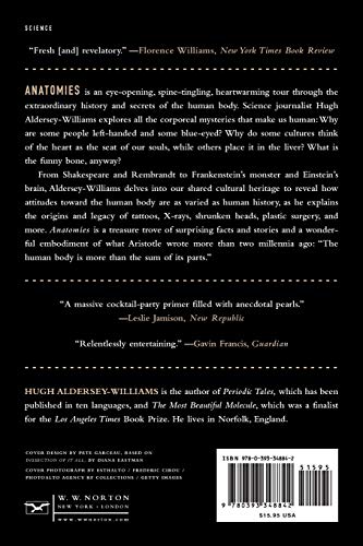 “A marvelous, organ-by-organ journey through the body eclectic…Irresistible [and] impressive.” –John J. Ross, Wall Street Journal The human body is the most fraught and fascinating, talked-about and taboo, unique yet universal fact of our lives. It is the inspiration for art, the subject of science, and the source of some of the greatest stories ever told. In Anatomies, acclaimed author of Periodic Tales Hugh Aldersey-Williams brings his entertaining blend of science, history, and culture to bear on this richest of subjects. In an engaging narrative that ranges from ancient body art to plastic surgery today and from head to toe, Aldersey-Williams explores the corporeal mysteries that make us human: Why are some people left-handed and some blue-eyed? What is the funny bone, anyway? Why do some cultures think of the heart as the seat of our souls and passions, while others place it in the liver? A journalist with a knack for telling a story, Aldersey-Williams takes part in a drawing class, attends the dissection of a human body, and visits the doctor’s office and the morgue. But Anatomies draws not just on medical science and Aldersey-Williams’s reporting. It draws also on the works of philosophers, writers, and artists from throughout history. Aldersey-Williams delves into our shared cultural heritage–Shakespeare to Frankenstein, Rembrandt to 2001: A Space Odyssey–to reveal how attitudes toward the human body are as varied as human history, as he explains the origins and legacy of tattooing, shrunken heads, bloodletting, fingerprinting, X-rays, and more. From Adam’s rib to van Gogh’s ear to Einstein’s brain, Anatomies is a treasure trove of surprising facts and stories and a wonderful embodiment of what Aristotle wrote more than two millennia ago: “The human body is more than the sum of its parts.” 16 illustrations