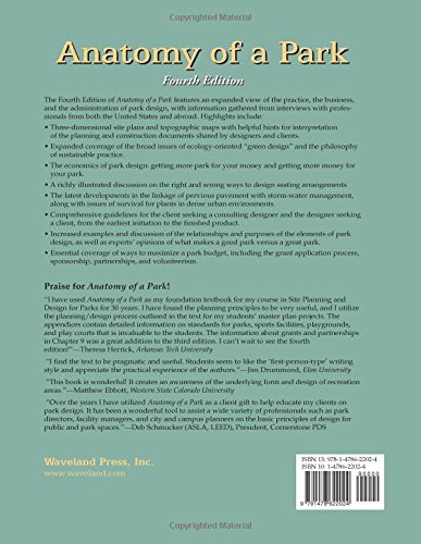 The Fourth Edition of Anatomy of a Park features an expanded view of the practice, the business, and the administration of park design, with information gathered from interviews with professionals from both the United States and abroad. Highlights include: Three-dimensional site plans and topographic maps with helpful hints for interpretation of the planning and construction documents shared by designers and clients. Expanded coverage of the broad issues of ecology-oriented “green design” and the philosophy of sustainable practice. The economics of park design: getting more park for your money and getting more money for your park. A richly illustrated discussion on the right and wrong ways to design seating arrangements. The latest developments in the linkage of pervious pavement with storm-water management, along with issues of survival for plants in dense urban environments. Comprehensive guidelines for the client seeking a consulting designer and the designer seeking a client, from the earliest initiation to the finished product. Increased examples and discussion of the relationships and purposes of the elements of park design, as well as experts’ opinions of what makes a good park versus a great park. Essential coverage of ways to maximize a park budget, including the grant application process, sponsorship, partnerships, and volunteerism. Titles of related interest from Waveland Press: Booth, Basic Elements of Landscape Architectural Design (ISBN 9780881334784) and Murphy, Landscape Architecture Theory: An Evolving Body of Thought (ISBN 9781577663577).