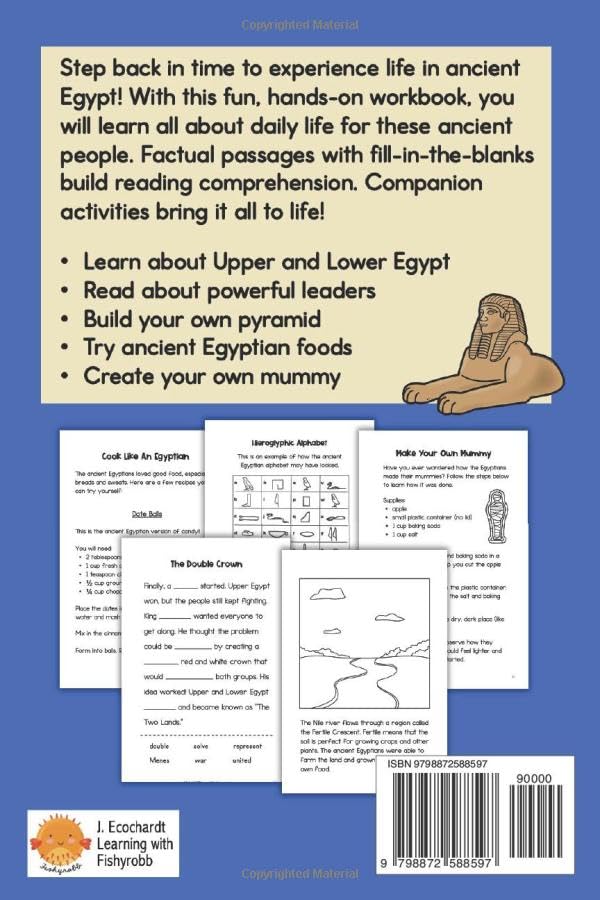 Step back in time to experience life in ancient Egypt! With this fun, hands-on history workbook, you will learn all about daily life in ancient times. Factual passages about the Egyptian civilization with fill-in-the-blanks build reading comprehension. Companion activities bring it all to life! Learn about Upper and Lower Egypt, King Menes, and the double crown Read about powerful leaders like King Tut and Cleopatra Build your own pyramid craft Try ancient Egyptian foods with easy-to-follow recipes Create your own mummy and learn about the mummification process Learn about hieroglyphics and write your own name All this and more is in this engaging ancient Egypt activity book for kids ages 7 to 10. Perfect for curious kids who enjoy history and want to know more about the past or as part of your homeschool history curriculum and ancient Egypt lesson plans.