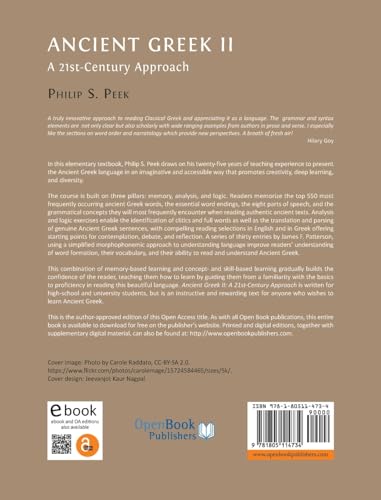 In this elementary textbook, Philip S. Peek draws on his twenty-five years of teaching experience to present the ancient Greek language in an imaginative and accessible way that promotes creativity, deep learning, and diversity. The course is built on three pillars: memory, analysis, and logic. Readers memorize the top 550 most frequently occurring ancient Greek words, the essential word endings, the eight parts of speech, and the grammatical concepts they will most frequently encounter when reading authentic ancient texts. Analysis and logic exercises enable the identification of clitics and full words as well as the translation and parsing of genuine ancient Greek sentences, with compelling reading selections in English and in Greek offering starting points for contemplation, debate, and reflection. A series of thirty entries by James F. Patterson, using a simplified morphophonemic approach to understanding language improve readers’ understanding of word formation, their vocabulary, and their ability to read and understand Ancient Greek. This combination of memory-based learning and concept- and skill-based learning gradually builds the confidence of the reader, teaching them how to learn by guiding them from a familiarity with the basics to proficiency in reading this beautiful language. Ancient Greek II: A 21st-Century Approach is written for high-school and university students, but is an instructive and rewarding text for anyone who wishes to learn ancient Greek.