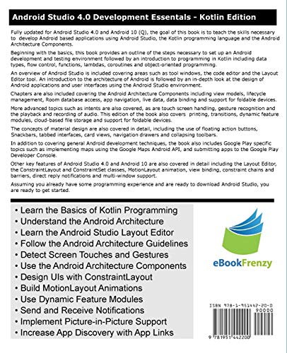 Fully updated for Android Studio 4.0, the goal of this book is to teach the skills necessary to develop Android based applications using the Kotlin programming language. Beginning with the basics, this book provides an outline of the steps necessary to set up an Android development and testing environment followed by an introduction to programming in Kotlin including data types, flow control, functions, lambdas, coroutines and object-oriented programming. An overview of Android Studio is included covering areas such as tool windows, the code editor and the Layout Editor tool. An introduction to the architecture of Android is followed by an in-depth look at the design of Android applications and user interfaces using the Android Studio environment. Chapters are also included covering the Android Architecture Components including view models, lifecycle management, Room database access, app navigation, live data and data binding. More advanced topics such as intents are also covered, as are touch screen handling, gesture recognition, and the recording and playback of audio. This edition of the book also covers printing, transitions, cloud-based file storage and foldable device support. The concepts of material design are also covered in detail, including the use of floating action buttons, Snackbars, tabbed interfaces, card views, navigation drawers and collapsing toolbars. In addition to covering general Android development techniques, the book also includes Google Play specific topics such as implementing maps using the Google Maps Android API, and submitting apps to the Google Play Developer Console. Other key features of Android Studio 4.0 and the Android SDK are also covered in detail including the Layout Editor, the ConstraintLayout and ConstraintSet classes, view binding, MotionLayout animation, constraint chains and barriers, direct reply notifications and foldable device support. Chapters also cover advanced features of Android Studio such as App Links, Dynamic Delivery, the Android Studio Profiler and Gradle build configuration. Assuming you already have some programming experience, are ready to download Android Studio and the Android SDK, have access to a Windows, Mac or Linux system and ideas for some apps to develop, you are ready to get started.