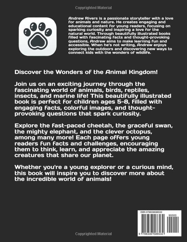 Discover the Wonders of the Animal Kingdom! Join us on an exciting journey through the fascinating world of animals, birds, reptiles, insects, and marine life! This beautifully illustrated book is perfect for children ages 5-8, filled with engaging facts, colorful images, and thought-provoking questions that spark curiosity. Explore the fast-paced cheetah, the graceful swan, the mighty elephant, and the clever octopus, among many more! Each page offers young readers fun facts and challenges, encouraging them to think, learn, and appreciate the amazing creatures that share our planet. Whether you’re a young explorer or a curious mind, this book will inspire you to discover more about the incredible world of animals!
